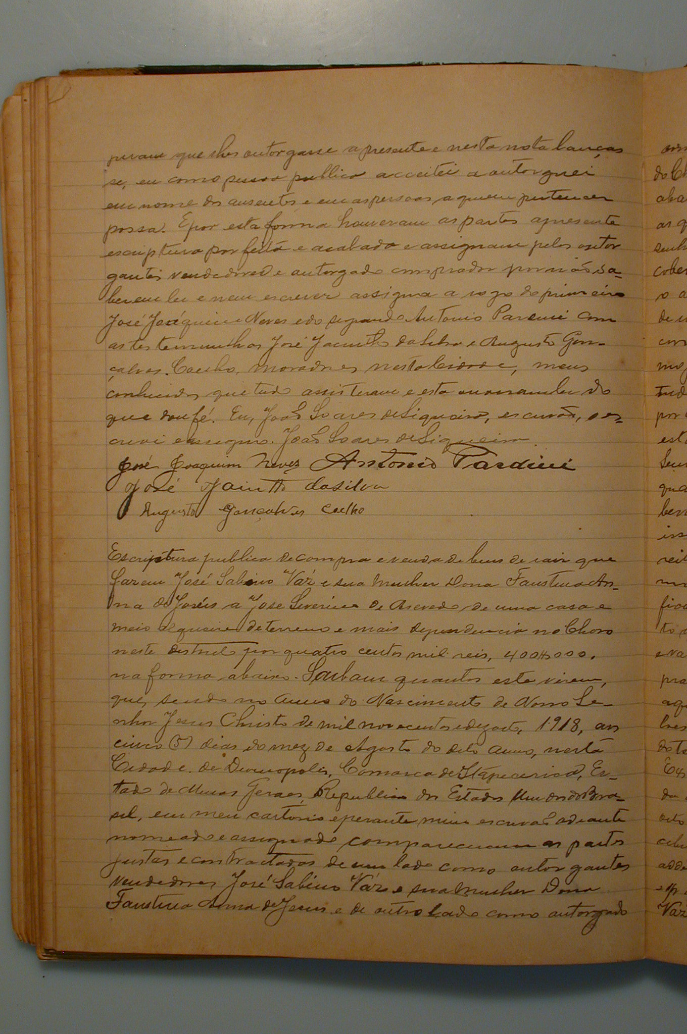ESCRITURA PÚBLICA DE COMPRA E VENDA DE BENS DE RAIZ QUE FAZEM JOSÉ SABINO VAS E SUA MULHER DONA FAUSTINA ANNA DE JESUS A JOSÉ SEVERINO DE ASEVEDO, DE 1 CASA E ½ DE TERRENO E MAIS DEPENDÊNCIA NO CHORO, NESTA CIDADE DE DIVINÓPOLIS.