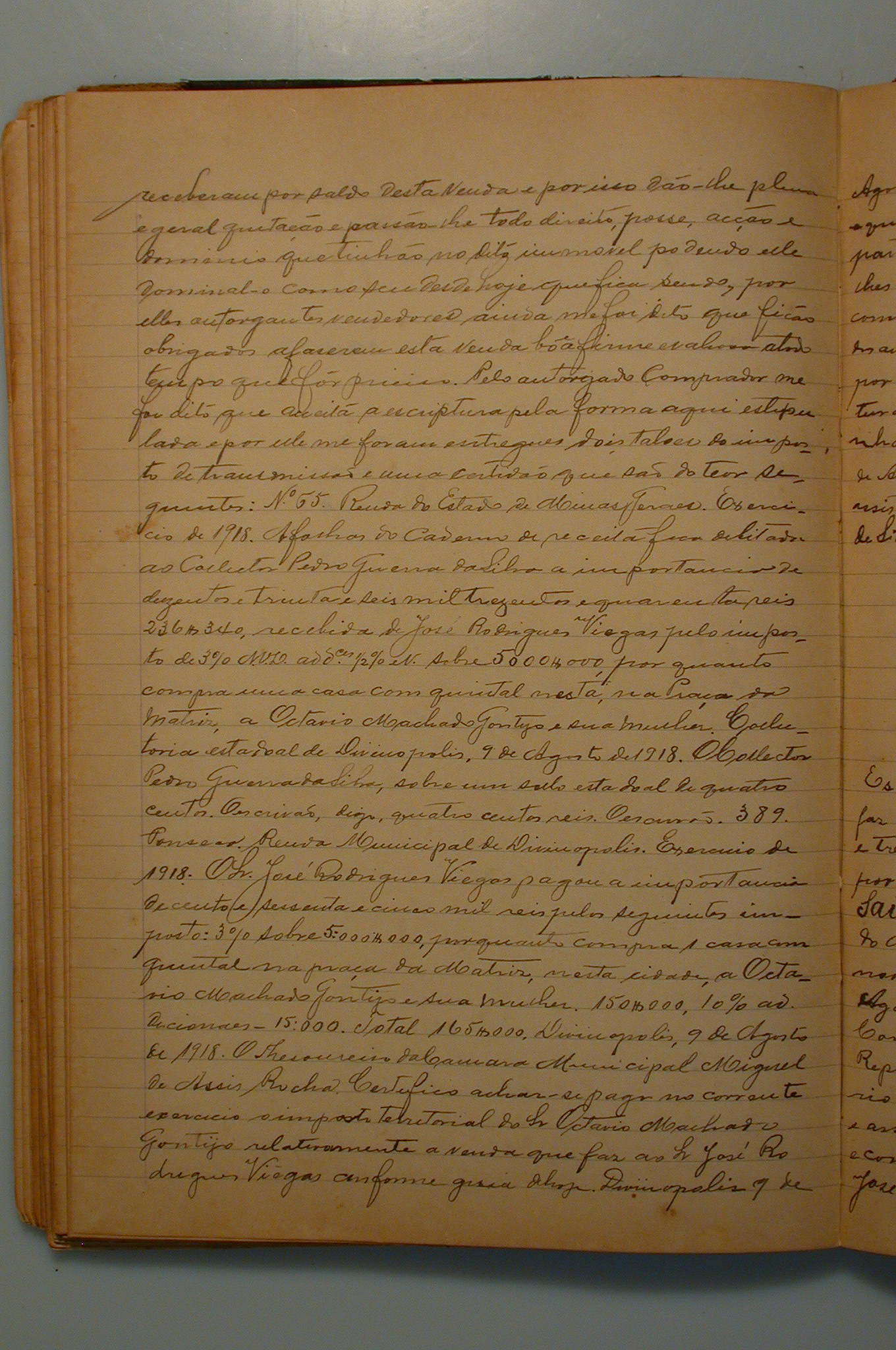 ESCRITURA PÚBLICA DE COMPRA E VENDA DE BENS DE RAIZ QUE FAZEM OCTÁVIO MACHADO GONTIJO E SUA MULHER DONA MARIA DOS SANTOS GONTIJO A JOSÉ RODRIGUES VIEGAS DE UMA CASA E TERRENO FECHADO NA PRAÇA DA MATRIZ DESSA CIDADE DE DIVINÓPOLIS, AOS 10 DIAS DO MÊS DE AGOSTO DE 1918.