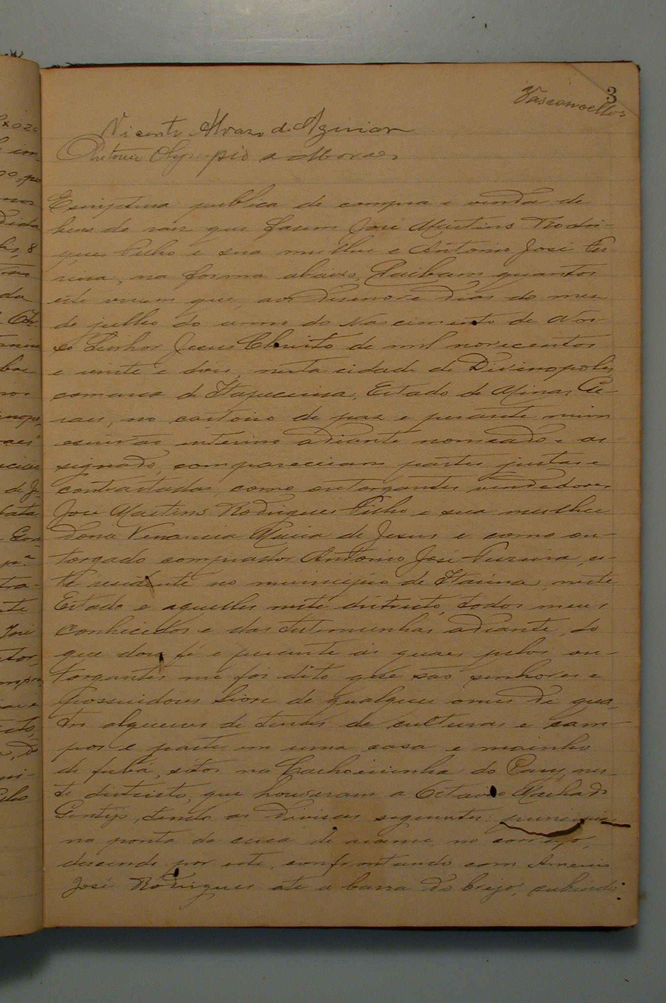 ESCRITURA PÚBLICA DE COMPRA E VENDA DE BENS DE RAÍZ , QUE FAZEM DONA FIRMINA CANDIDA DE JESUS AO COMPRADOR MIGUEL DE SOUSA ROCHA DE DOIS ALQUERES DE TERRA, SITUADO NA FAZENDA DO LOPES, PELA QUANTIA DE CEM MIL RÉIS. ESCRIVÃO: FRANCISCO MACHADO GONTIJO.