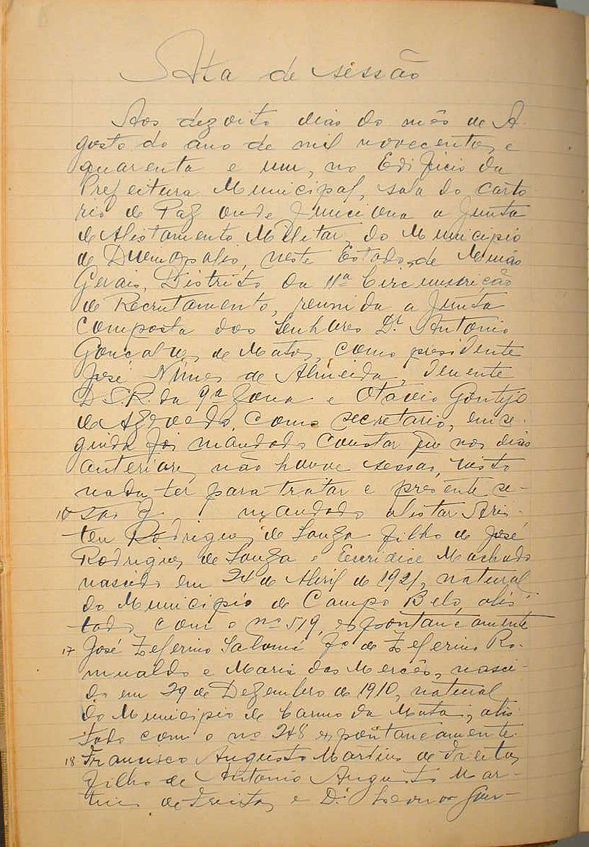 AOS DEZOITO DIAS DO MÊS DE AGOSTO DE 1941, NO EDIFÍCIO DA PREFEITURA, REUNIDA A JUNTA COMPOSTA POR ANTÔNIO GONÇALVES DE MATOS PRESIDENTE E OTÁVIO GONTIJO DE AZEVEDO SECRETÁRIO, EM SEGUIDA FOI MANDADO CONSTAR QUE NOS DIAS ANTERIORES NÃO HOUVE SESSÃO, VISTO NADA TER PARA TRATAR, EM SEGUIDA ALISTOU-SE VÁRIOS CIDADÃOS.