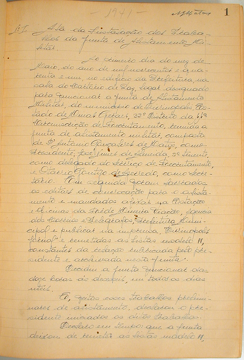 AO 1º DIA DO MÊS DE MAIO DE 1941, NO EDIFICIO DA PREFEITURA, REUNIDA A JUNTA DE ALISTAMENTO MILITAR, EM SEGUIDA FORAM LAVRADOS OS EDITAIS DE CONVOCAÇÃO PARA O ALISTAMENTO E MANDADOS AFIXAR NA ESTAÇÃO E OFICINAS DA REDE MINEIRA DE VIAÇÃO.