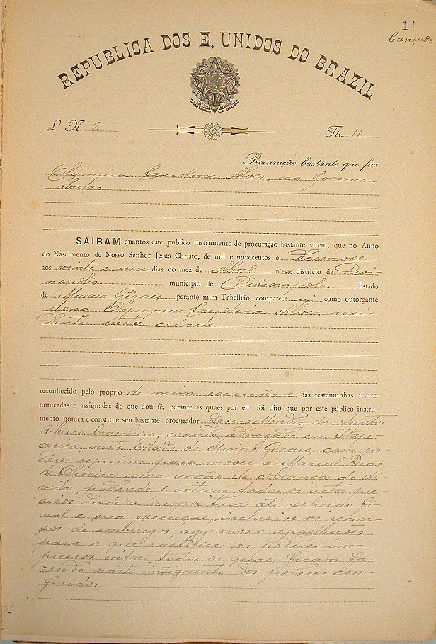 PROCURAÇÃO BASTANTE QUE FAZ OLYMPIA CAROLINA ALVES QUE NOMEIA COMO SEU PROCURADOR O ADVOGADO SEVERO MENDES DOS SANTOS RIBEIRO COM PODERES ESPECIAIS PARA MOVER A MARÇAL DIAS DE OLIVEIRA UMA ACÇÃO DE COBRANÇA.