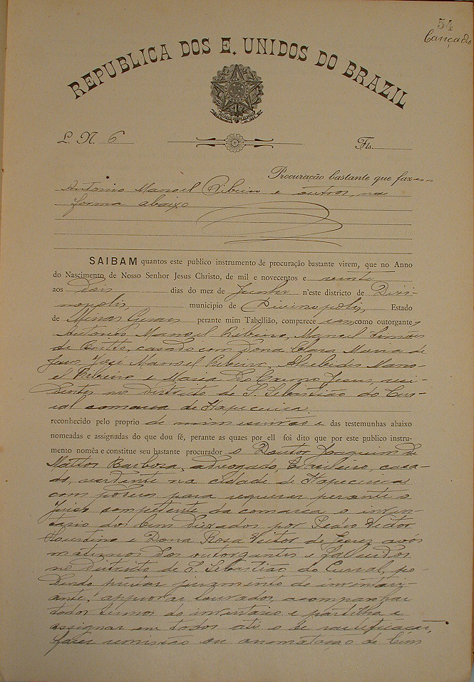 PROCURAÇÃO BASTANTE QUE FAZEM ANTONIO MANOEL RIBEIRO, MANOEL SIMÕES DE BRITO, CASADO COM CLARA MARIA DE JESUS, JOSÉ MANOEL RIBEIRO, ALCEBIADES MANOEL RIBEIRO E MARIA DO CARMO JESUS QUE NOMEARAM COMO SEU PROCURADOR O DOUTOR JOAQUIM DE MATTOS BARBOSA ADVOGADO COM PODERES PARA REQUERER PERANTE O JUISO COMPETENTE DA COMARCA O INVENTÁRIO DOS BENS DEIXADOS POR PEDRO VICTOR FLORESTINO E DONA ROSA VICTOR DE JESUS AVÓS MATERNOS DOS AUTORGANTES E FALLECIDOS.