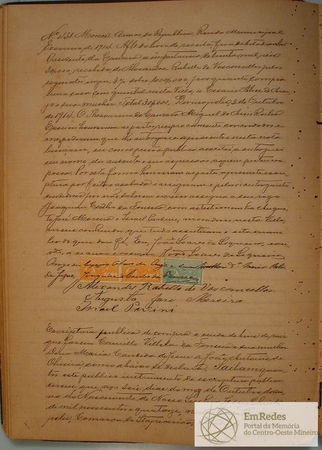 ESCRITURA PÚBLICA DE COMPRA E VENDA DE BENS DE RAIZ QUE FASEM CESÁRIO ALVES DE ARAÚJO E SUA MULHER DONA MARIA RITA DE JESUS A ALEXANDRE RABELO DE VASCONCELLOS, AOS 03 DIAS DO MÊS DE OUTUBRO DE 1914, NESTA VILLA DIVINÓPOLIS, A VENDA DE UMA CASA PEQUENA, TÉRREA, CÔMODO PEQUENO PARA NEGOCIO, COM TERRENO PARA QUINTAL E DEMAIS DEPENDÊNCIAS NESTA VILLA, PELO PREÇO E QUANTIA DE 1 CONTO DE RÉIS.