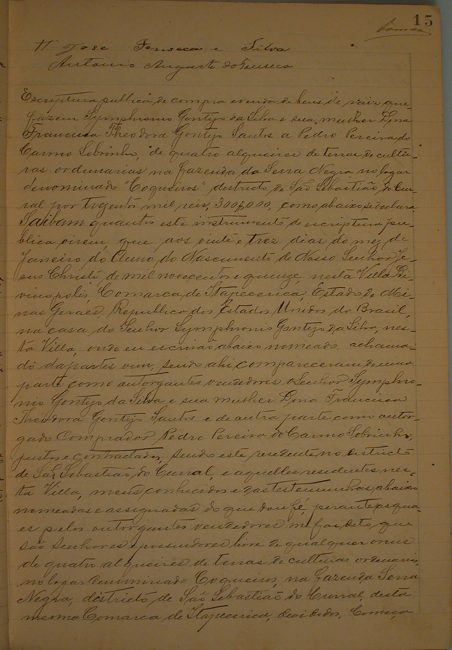 ESCRITURA PÚBLICA DE COMPRA E VENDA DE BENS DE RAIZ QUE FAZEM PEDRO JOSÉ DE SOUSA E SUA MULHER DONA CARMELITA NUNES DE MORAES A JOSÉ ANTÔNIO CHIBLE DE UMA CASA, QUINTAL,E SUAS DEPENDENCIAS NESTA VILA DE DIVINÓPOLIS, COMARCA DO ITAPECERICA, PELA QUANTIA DE (3:500$000) TRÊS CONTOS E QUINHENTOS MIL REIS, EM 05.01.1915.