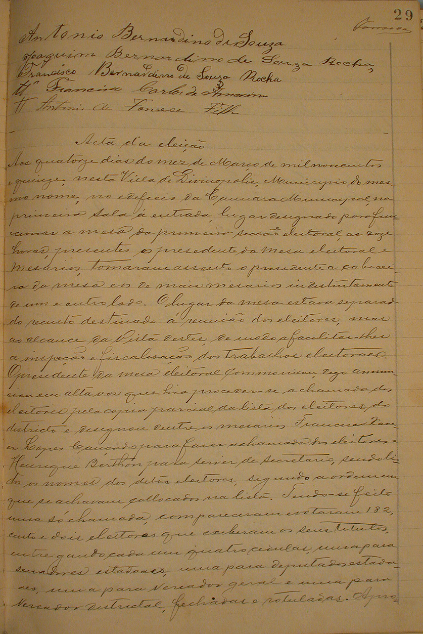 ACTA DA ELEIÇÃO, AOS 14 DIAS DO MÊS DE MARÇO DE 1915, NESTA VILA DIVINÓPOLIS, NO EDIFÍCIO DA CÂMARA MUNICIPAL, PARA ELEIÇÃO DE 1 VEREADOR GERAL, 1 VEREADOR DISTRITAL, 1 SENADOR ESTADUAL E 1 DEPUTADO ESTADUAL, COMPARECERAM E VOTARAM 182 ELEITORES. FINDA A LEITURA DAS CÉDULAS, TIVERAM VOTOS OS CIDADÃOS: PARA SENADOR ESTADUAL URIAS DE MELO BOTELHO 104 VOTOS; PARA DEPUTADO ESTADUAL MONSENHOR JOÃO MARTINHO DE ALMEIDA, GABRIEL DE ANDRADE E FRANKLIN BENJAMIM DE CASTRO 182 VOTOS;PARA VEREADOR GERAL CORONEL ARISTOTELES EPIPHANIO PEREIRA 181 VOTOS; PARA VEREADOR DISTRITAL MAJOR FRANCISCO COELHO DA FONSECA 181 VOTOS.