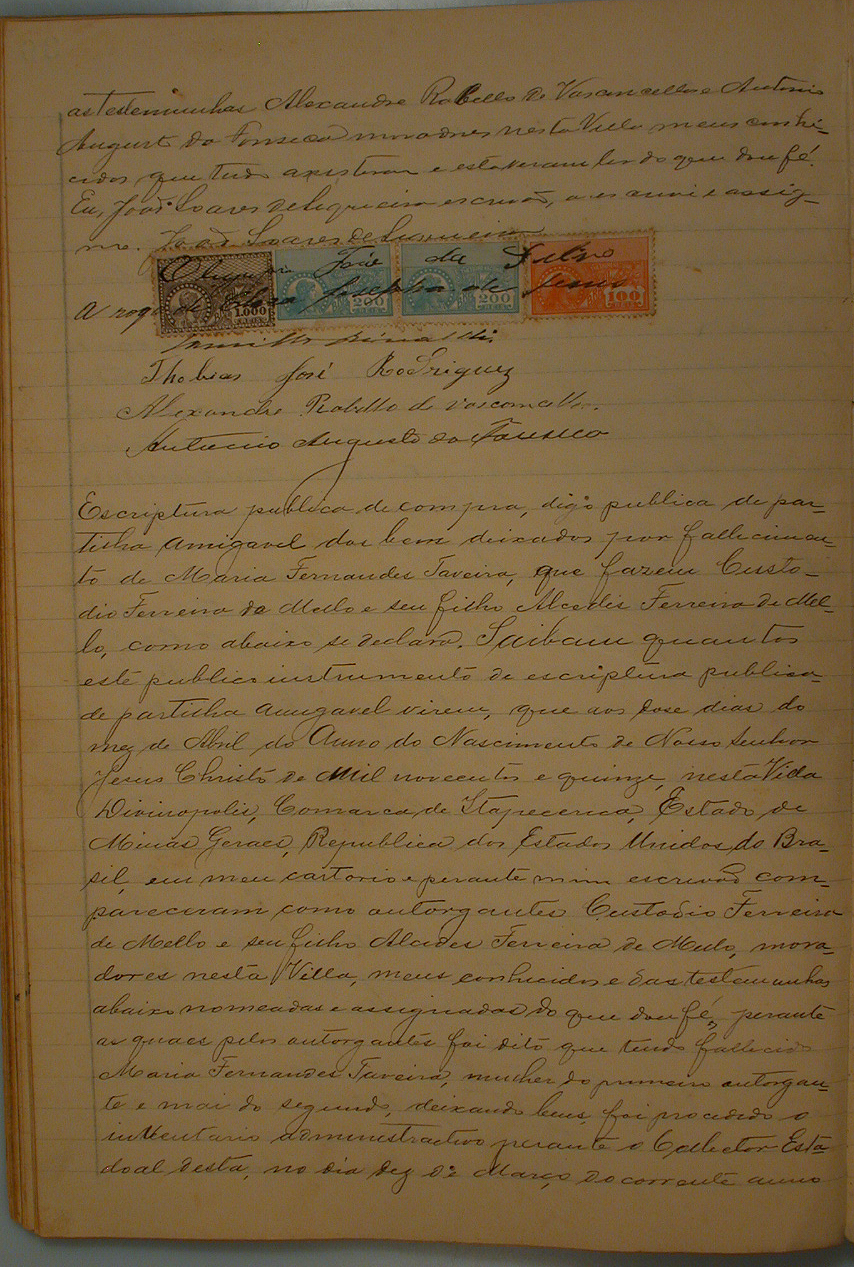 ESCRITURA PÚBLICA DE PARTILHA AMIGÁVEL DOS BENS DEIXADOS POR FALECIMENTO DE MARIA FERNANDES TEIXEIRA, QUE FASEM CUSTÓDIO FERREIRA DE MELO E SEU FILHO ALCIDES FERREIRA DE MELO, AOS 12 DIAS DO MÊS DE ABRIL DE 1915, NESTA VILA DIVINÓPOLIS.
