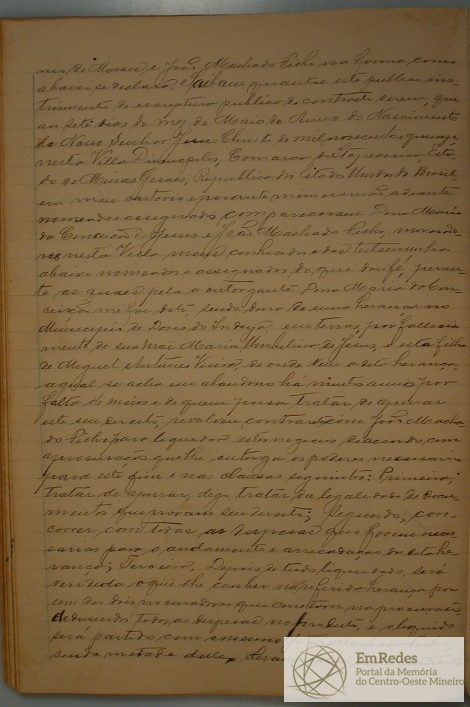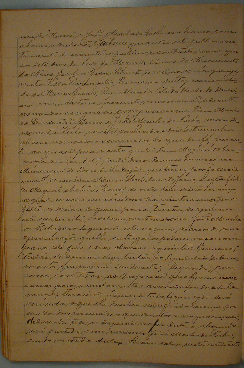 ESCRITURA PÚBLICA DE CONTRATO QUE FASEM DONA MARIA DA CONCEIÇÃO DE JESUS VIÚVA DE JOÃO ANTÔNIO DE MORAES E JOÃO MACHADO FILHO, AOS 07 DIAS DO MÊS DE MAIO DE 1915, NESTA VILLA DIVINÓPOLIS, DE UMA HERANÇA EM DORES DO INDAIÁ, POR FALECIMENTO DE SUA MÃE MARIA UMBELINA DE JESUS, DE ONDE A DITA HERANÇA SE ACHA EM ABANDONO HÁ MUITOS ANOS POR FALTA DE MEIOS E DE QUEM POSSA TRATAR DE APURAR ESTE DIREITO CONTRATANDO JOÃO MACHADO FILHO PARA LEGALIZAR OS DOCUMENTOS, VENDER E DIVIDIR A HERANÇA COM O MESMO JOÃO MACHADO FILHO E DERAM VALOR DESTE CONTRATO DE (200$000) (DUZENTOS MIL REIS).