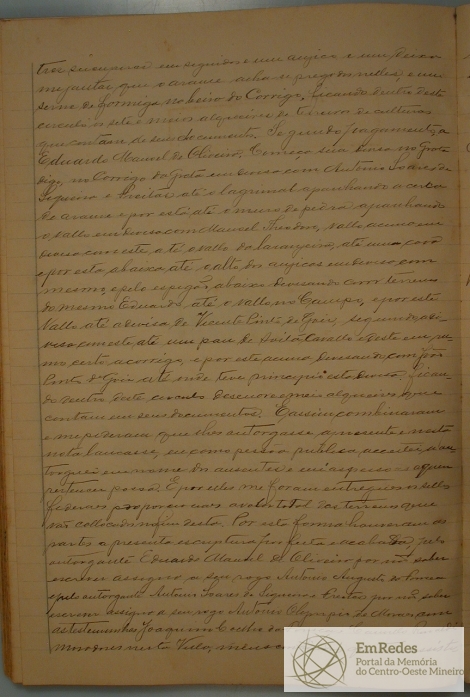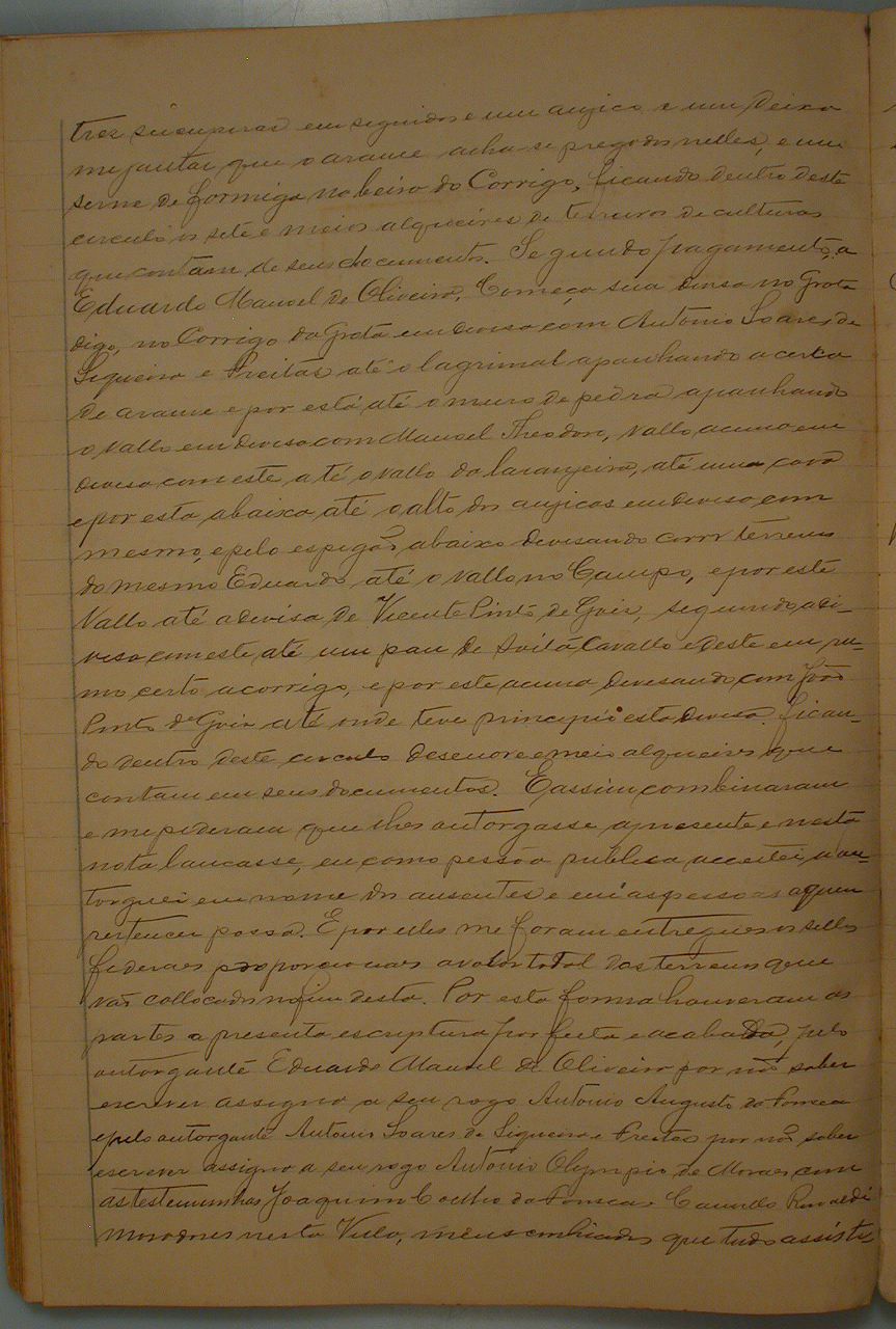 ESCRITURA PÚBLICA DE DIVISÃO QUE FAZEM EDUARDO MANOEL DE OLIVEIRA E ANTÔNIO SOARES DE SIQUEIRA E FREITAS, VINTE E SETE ALQUEIRES DE TERRA DE CULTURA NA FAZENDA DA BOA VISTA, NO LUGAR DENOMINADO GROTA DE TRÁS, DESTE DISTRITO, AOS 12 DIAS DO MÊS DE JULHO 1915, NESTA VILLA DIVINÓPOLIS, A QUANTIA (2:700$000) DOIS CONTOS E SETECENTOS MIL RÉIS.