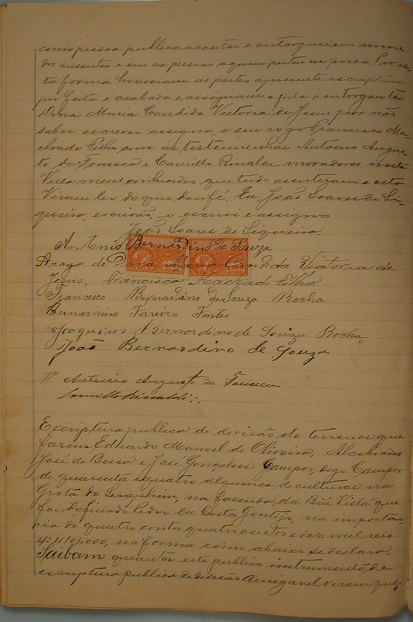 ESCRITURA PÚBLICA DE DIVISÃO DE TERRENO QUE FASEM EDUARDO MANOEL DE OLIVEIRA, ALCEBÍADES JOSÉ DE BESSA E JOSÉ GONÇALVES CAMPOS DE 44 ALQUEIRES DE CULTURA NA GROTA DO SERAPHIM, NA FASENDA DA BOA VISTA, AOS 24 DIAS DO MÊS DE JULHO DE 1915, NESTA VILA DIVINÓPOLIS.