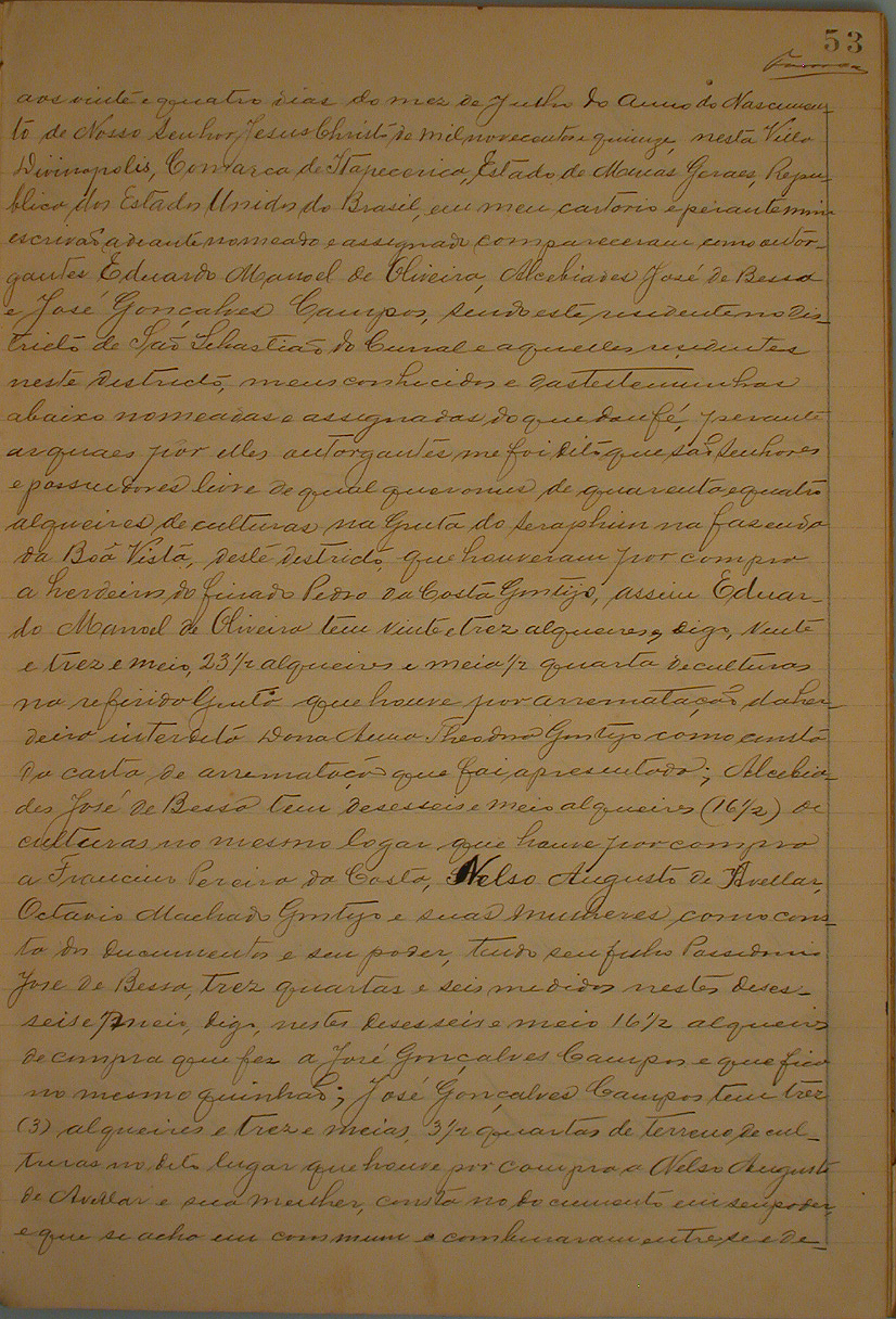 ESCRITURA PÚBLICA DE DIVISÃO DE TERRENO QUE FASEM EDUARDO MANOEL DE OLIVEIRA, ALCEBÍADES JOSÉ DE BESSA E JOSÉ GONÇALVES CAMPOS DE 44 ALQUEIRES DE CULTURA NA GROTA DO SERAPHIM, NA FASENDA DA BOA VISTA, AOS 24 DIAS DO MÊS DE JULHO DE 1915, NESTA VILA DIVINÓPOLIS.