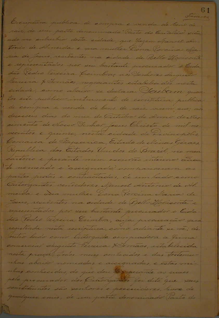 ESCRITURA PUBLICA DE COMPRA E VENDA DE BENS DE RAIZ DE UM PASTO COM 25 ALQUEIRES DENOMINADO “PASTO DO CATALÃO” SITUADO NO SUBÚRBIO DESTA CIDADE, QUE FASEM MANOEL ANTÔNIO DE ALMEIDA E SUA MULHER DONA PORCINA MARIA DE JESUS RESIDENTES EM BELO HORIZONTE E REPRESENTADO POR SEU PROCURADOR PEDRO TEIXEIRA COIMBRA E A AUGUSTO FERREIRA E IRMÃOS, AOS 16 DIAS DO MÊS DE OUTUBRO DE 1915, NESTA CIDADE DE DIVINÓPOLIS, PELA QUANTIA DE 6:000$000 (SEIS CONTOS DE RÉIS).