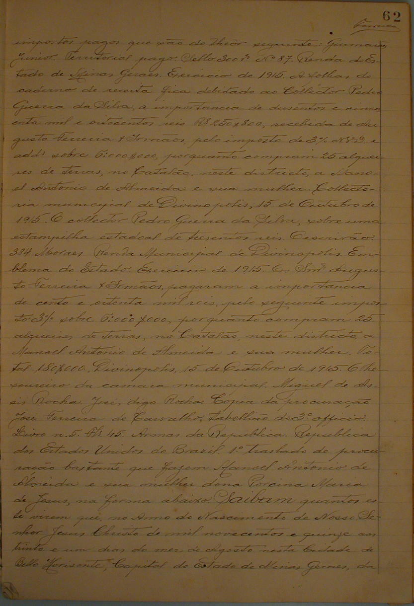 ESCRITURA PUBLICA DE COMPRA E VENDA DE BENS DE RAIZ DE UM PASTO COM 25 ALQUEIRES DENOMINADO “PASTO DO CATALÃO” SITUADO NO SUBÚRBIO DESTA CIDADE, QUE FASEM MANOEL ANTÔNIO DE ALMEIDA E SUA MULHER DONA PORCINA MARIA DE JESUS RESIDENTES EM BELO HORIZONTE E REPRESENTADO POR SEU PROCURADOR PEDRO TEIXEIRA COIMBRA E A AUGUSTO FERREIRA E IRMÃOS, AOS 16 DIAS DO MÊS DE OUTUBRO DE 1915, NESTA CIDADE DE DIVINÓPOLIS, PELA QUANTIA DE 6:000$000 (SEIS CONTOS DE RÉIS).