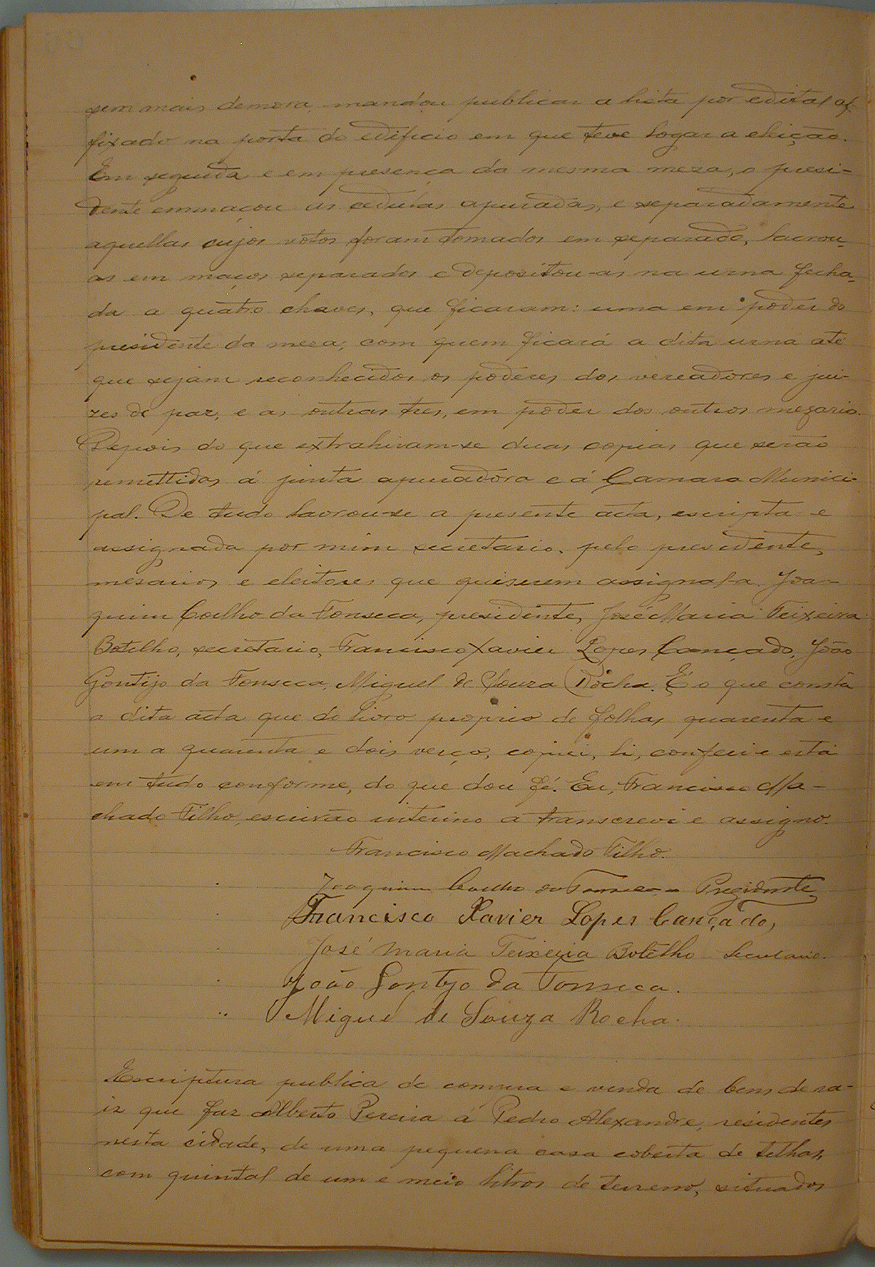 ACTA DE RECEBIMENTO DAS CÉDULAS E APURAÇÃO DE VOTOS DA 1ª SEÇÃO ELEITORAL DO MUNICÍPIO DE DIVINÓPOLIS PARA ELEIÇÃO DE 7 VEREADORES A CÂMARA MUNICIPAL E 3 JUISES DE PAZ. AO 1º DIA DO MÊS DE NOVEMBRO DE 1915, COMPARECERAM E VOTARAM 65 ELEITORES, FINDA A LEITURA DA CÉDULA TIVERAM VOTOS OS CIDADÃOS: ARISTOTELES EPIFANIO PEREIRA 54 VOTOS; CEL ANTÔNIO OLYMPIO DE MORAIS 64 VOTOS, DOMINGOS FERNANDES PIRES 31 VOTOS, JOÃO SEVERINO DE ASEVEDO 31 VOTOS, ARNALDO AUGUSTO DE AVELAR 08 VOTOS, MIGUEL DE SOUSA ROCHA 02 VOTOS, PEDRO COIMBRA 35 VOTOS, OCTAVIO MACHADO GONTIJO 34 VOTOS, ADOLPHO MACHADO 01 VOTO, PARA VEREADORES GERAIS: FRANCISCO COELHO DA FONSECA 64 VOTOS E ADOLPHO MACHADO 01 VOTO; PARA VEREADORES DISTRITAIS: FRANCISCO XAVIER LOPES CANÇADO 38 VOTOS, JOÃO DE OLIVEIRA PINTO 48 VOTOS, JOAQUIM COELHO DA FONSECA 39 VOTOS, JOSÉ GUIMARÃES DE FARIA 03 VOTOS, ANTÔNIO PEREIRA PINTO 01 VOTO E JOÃO MARTINS LARA 02 VOTOS PARA JUIZES DE PAZ.