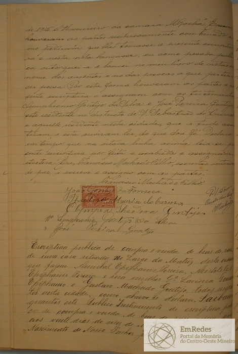 ESCRITURA PÚBLICA DE COMPRA E VENDA DE BENS DE RAIZ, DE UMA CASA SITUADA NO LARGO DA MATRIZ DESTA CIDADE, COBERTAS DE TELHAS COM 4 CÔMODOS QUE FASEM ANÍBAL EPIPHANIO PEREIRA, ARISTÓTELES EPIFÂNIO PEREIRA E SUA MULHER DONA LAVINIA FONSECA EPIPHANIO A GUSTAVO MACHADO GONTIJO, AOS 20 DIAS DO MÊS DE NOVEMBRO DE 1915, NESTA CIDADE DE DIVINÓPOLIS, PELO PREÇO E QUANTIA DE (2:000$000) DOIS CONTOS DE REIS.