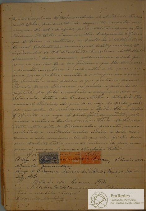 ESCRITURA PÚBLICA DE COMPRA E VENDA DE BENS DE RAIZ QUE FAZEM JOÃO FERREIRA DA SILVA E SUA MULHER DONA ROSALINA MARIA TAVARES A AUDÊNCIO FERREIRA DA SILVA, AO 1º DIA DO MÊS DE JANEIRO DE 1916, NESTA CIDADE DE DIVINÓPOLIS, A VENDA DE 1 ALQUEIRE ½ QUARTA DE TERRAS DE CULTURA NO LUGAR DENOMINADO CAPÃO REDONDO, CACOCO DE BAIXO, PELA QUANTIA DE (300$000) TREZENTOS MIL RÉIS.