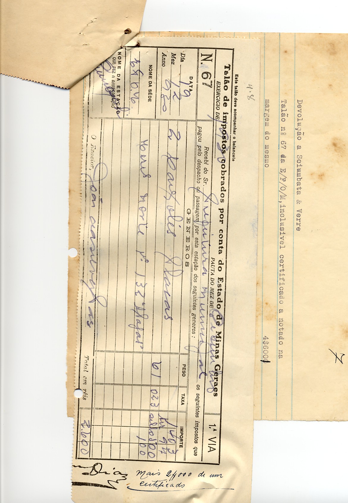 PAGUE-SE AO SENHOR SCIUMBATA E VERRE, DE ACCORDO COM A LEI Nº 179 DE 12 DE NOVEMBRO DE 1929, PELA VERBA EXPEDIENTES A QUANTIA DE 43$900 (QUARENTA E TRÊS MIL E NOVECENTOS RÉIS).