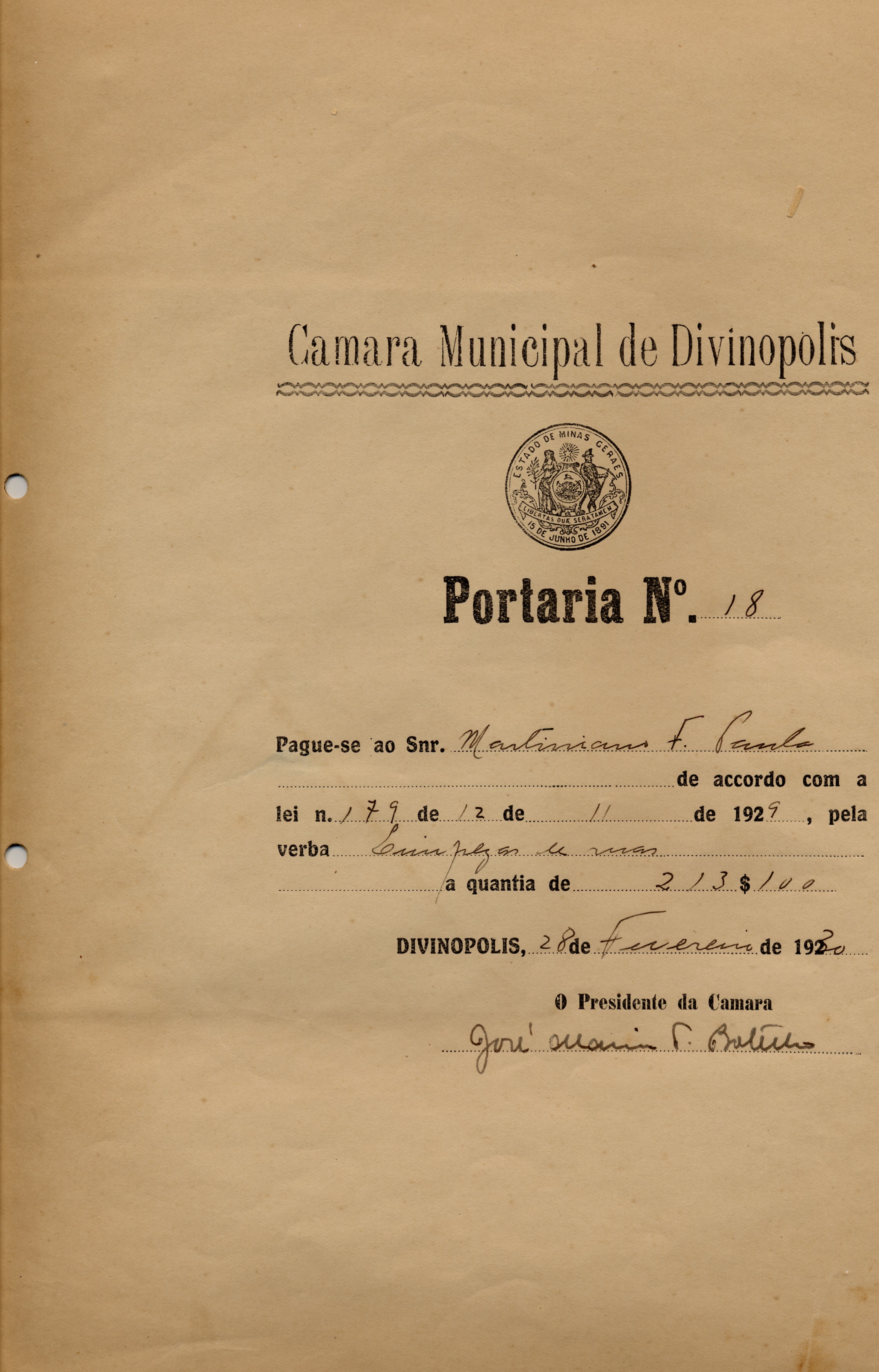 PAGUE-SE AO SNR MARTINIANO F. PAULA DE ACCORDO(SIC) COM A LEI Nº 179 DE 12 DE NOVEMBRO DE 1929, PELA VERBA LIMPEZAS DE RUAS A QUANTIA DE 213$ 100 ( DUZENTOS E TREZE MIL E CEM REIS).