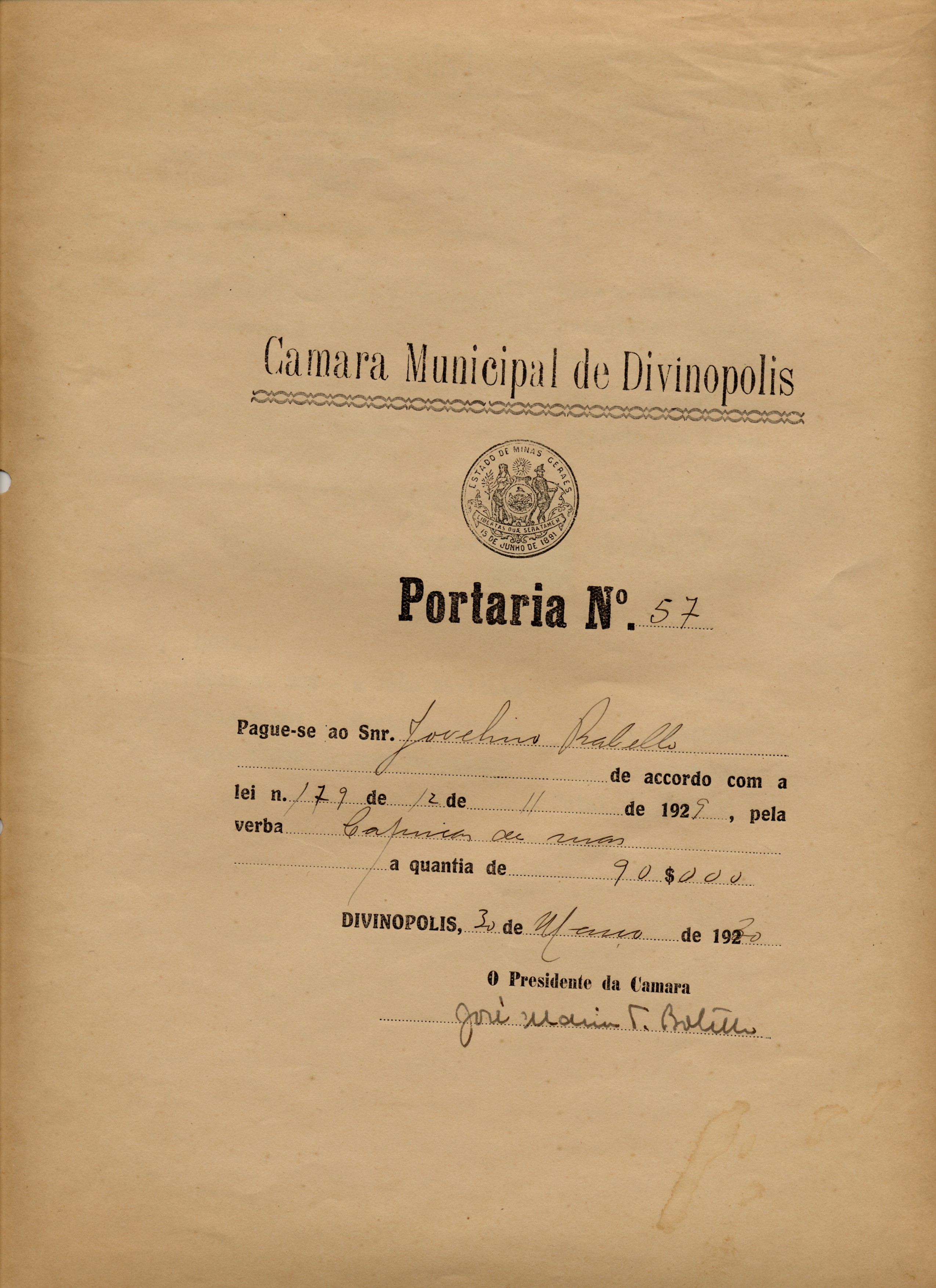 PAGUE-SE AO SENHOR JOVELINO RABELLO DE ACCORDO(SIC) COM LEI Nº 179 DE 12 DE NOVEMBRO DE 1929, PELA VERBA CAPINAS DE RUAS, A QUANTIA DE 90$000 (NOVENTA MIL RÉIS).