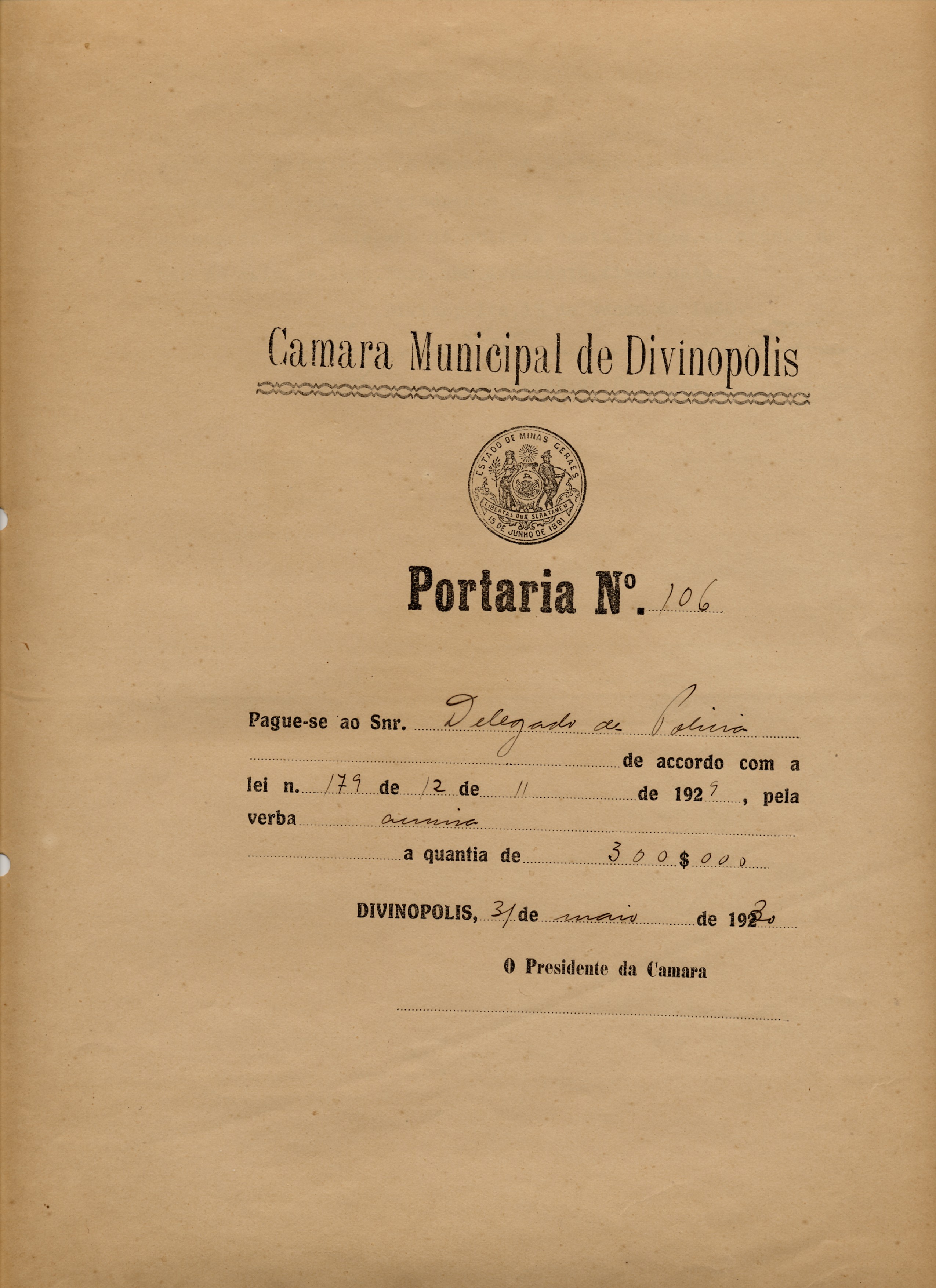 PAGUE-SE AO SNR DELEGADO DE POLÍCIA DE ACCORDO(SIC) COM A LEI Nº 179 DE 12 DE NOVEMBRO DE 1929, PELA VERBA ACIMA A QUANTIA DE 300$000 (TREZENTOS MIL RÉIS).