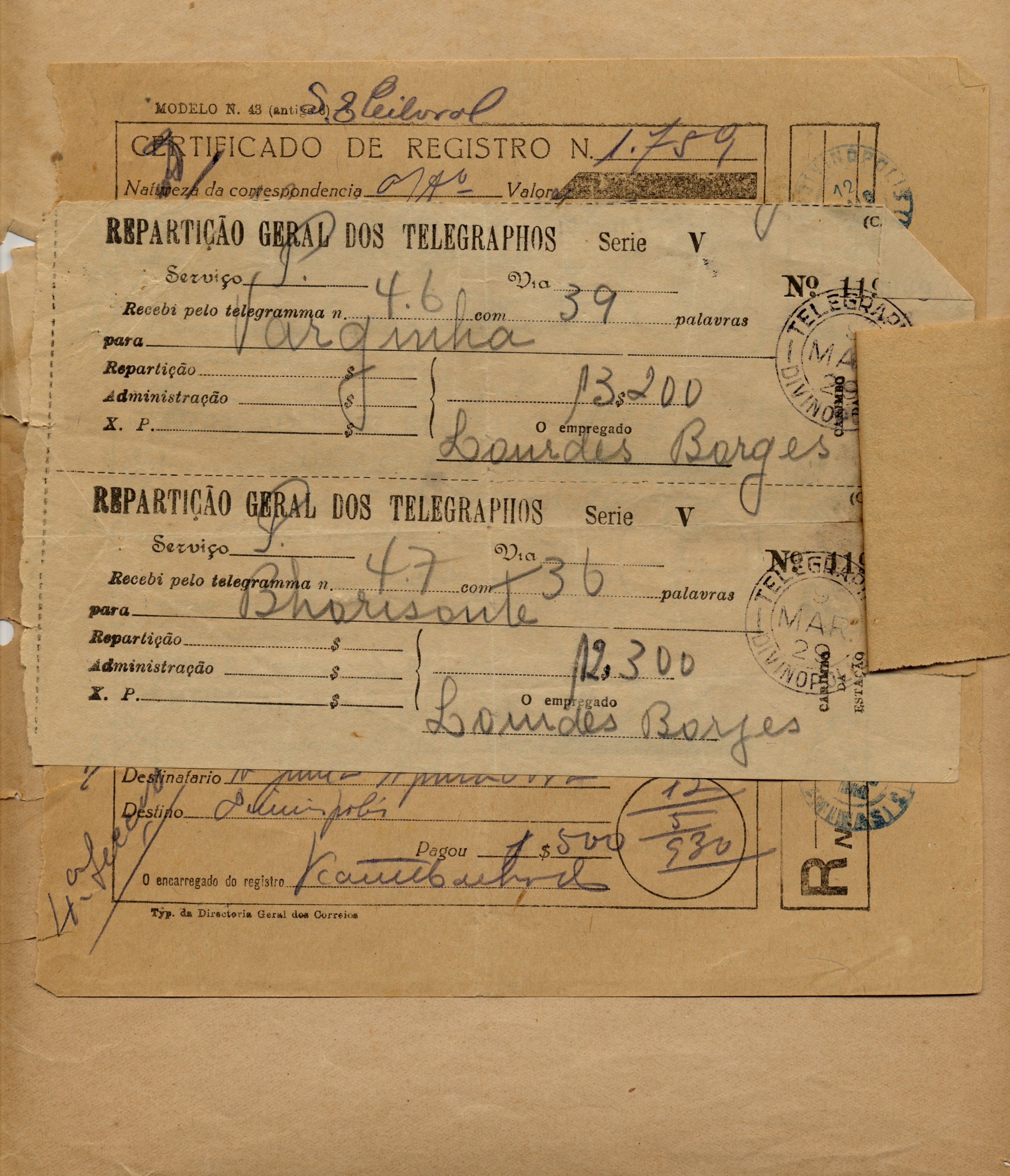 OBS: 7 RECIBOS DE REGISTROS DE TELEGRAMAS , DATADOS DE: