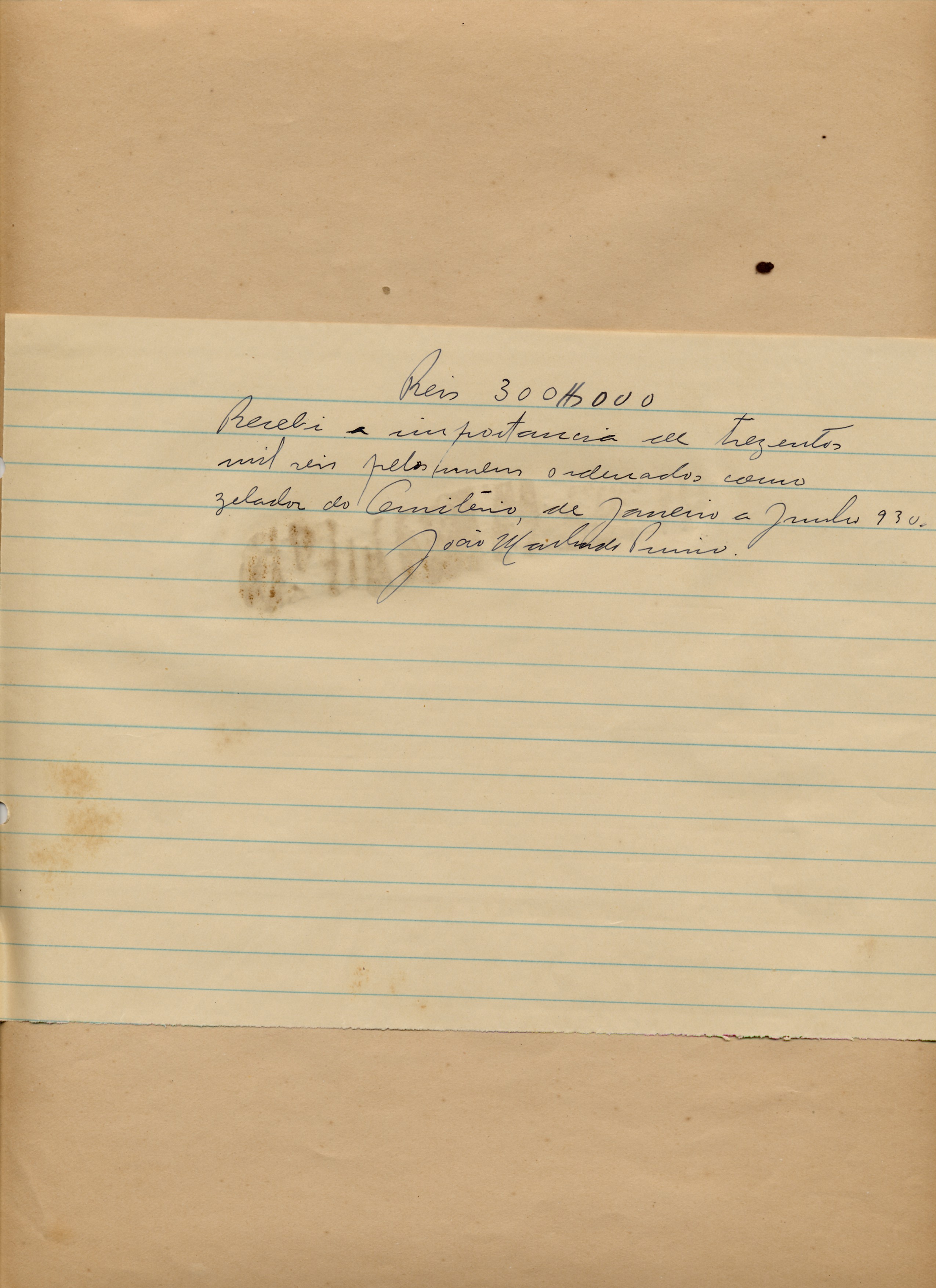 OBS: UM RECIBO DE PAGAMENTO REFERENTE AOS ORDENADOS DO MESMO COMO ZELADOR DO CEMITÉRIO DE JANEIRO A JUNHO DE 1930.