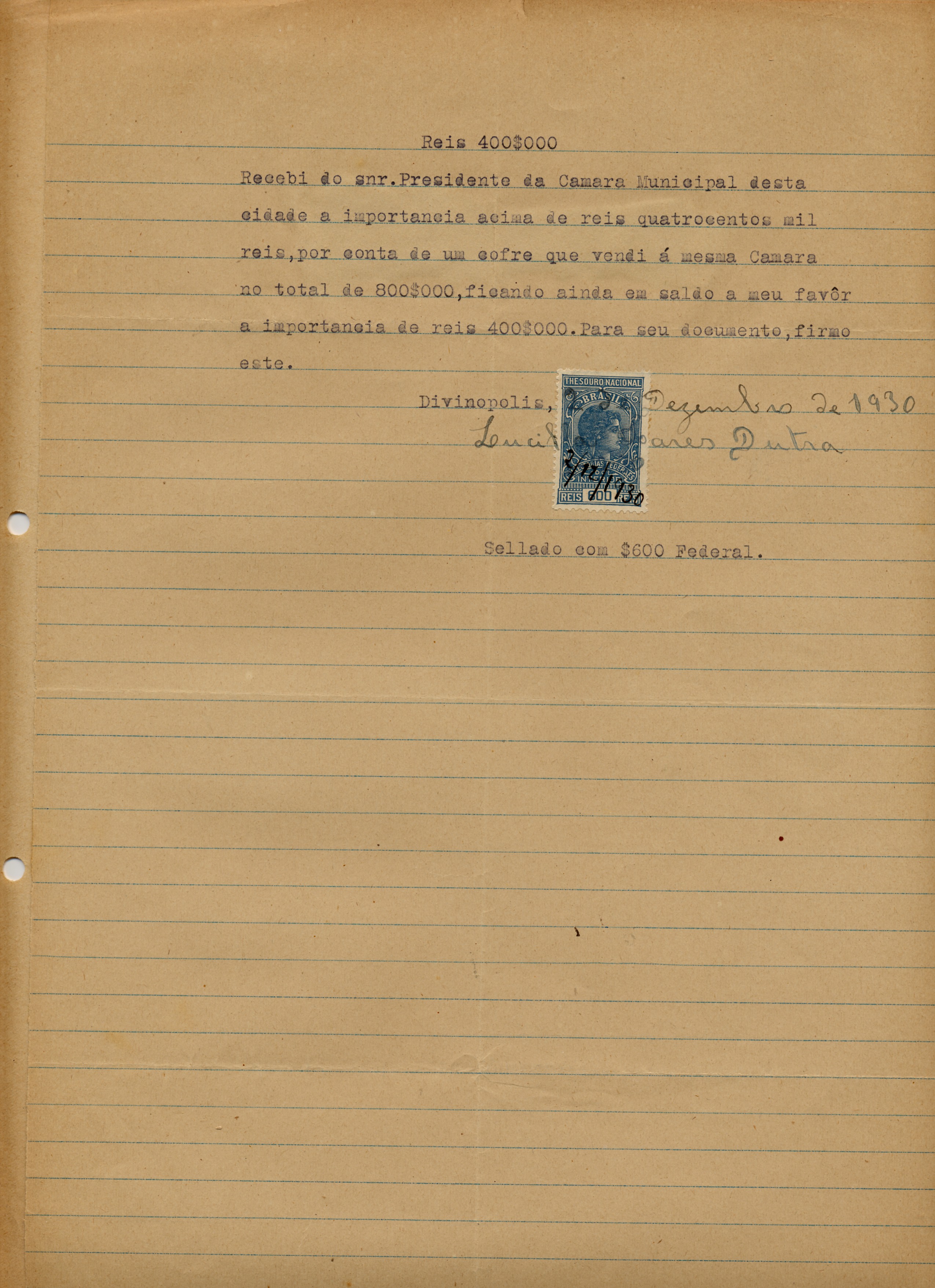 OBS: RECIBO POR CONTA DE UM COFRE VENDIDO À MESMA CÂMARA NO TOTAL DE 800$000 (OITOCENTOS MIL RÉIS) FICANDO SALDO EM FAVOR A IMPORTÂNCIA DE RÉIS 400$800.