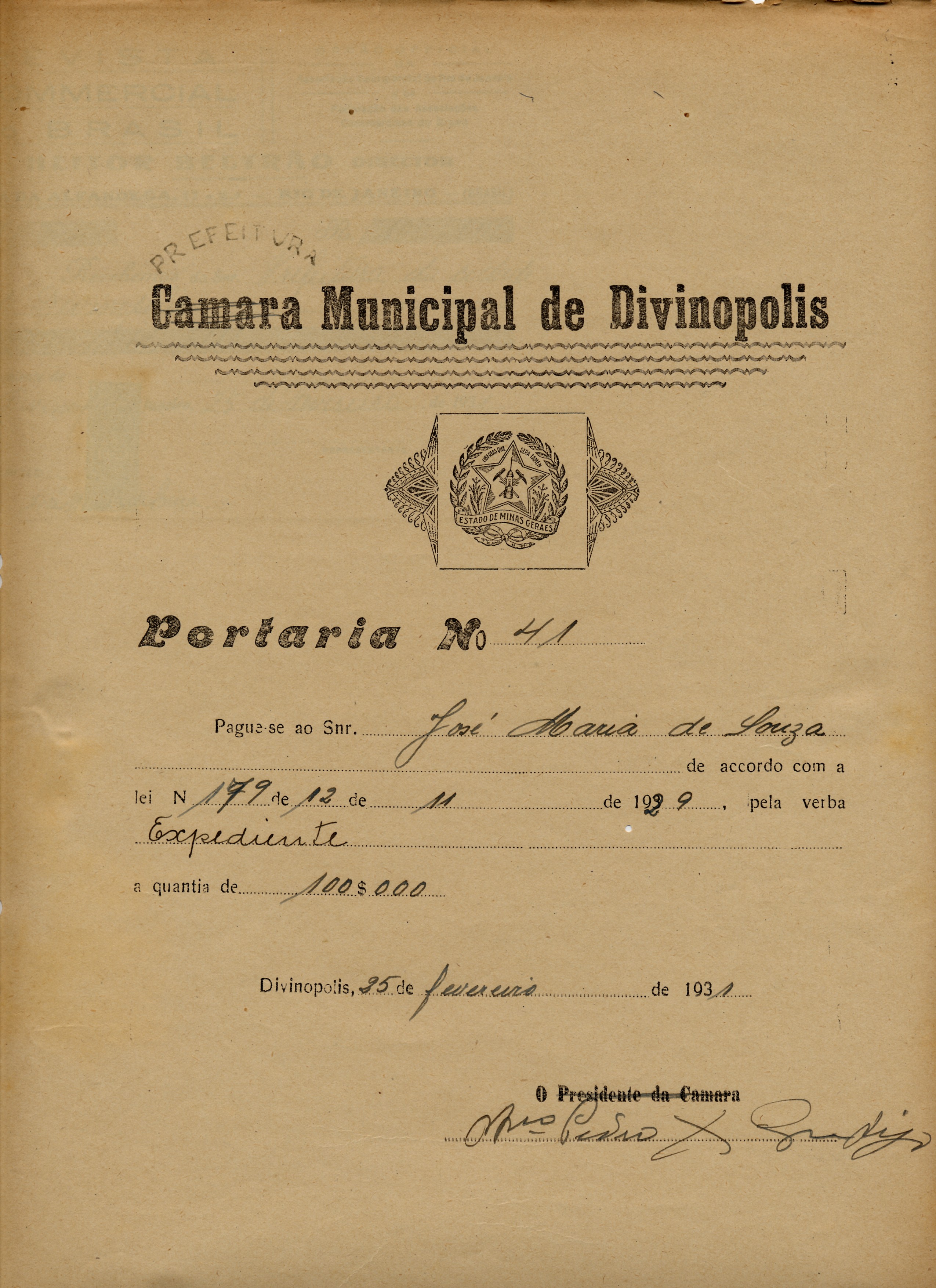 PAGUE-SE AO SNR JOSÉ MARIA DE SOUZA DE ACCORDO(SIC) COM A LEI Nº 179 DE 12 DE NOVEMBRO DE 1929, PELA VERBA EXPEDIENTE A QUANTIA DE 100$000 (CEM MIL RÉIS).