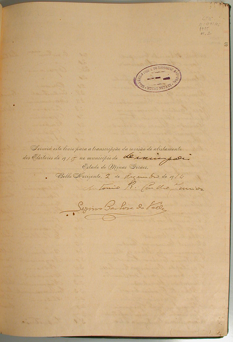 LIVRO DE TRANSCRIÇÃO DA REVISÃO DE ALISTAMENTO DOS ELEITORES DE 1915 NO MUNICÍPIO DE DIVINÓPOLIS - MG, ASSINADO POR ANTONIO R. COELHO JÚNIOR.
