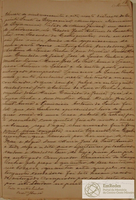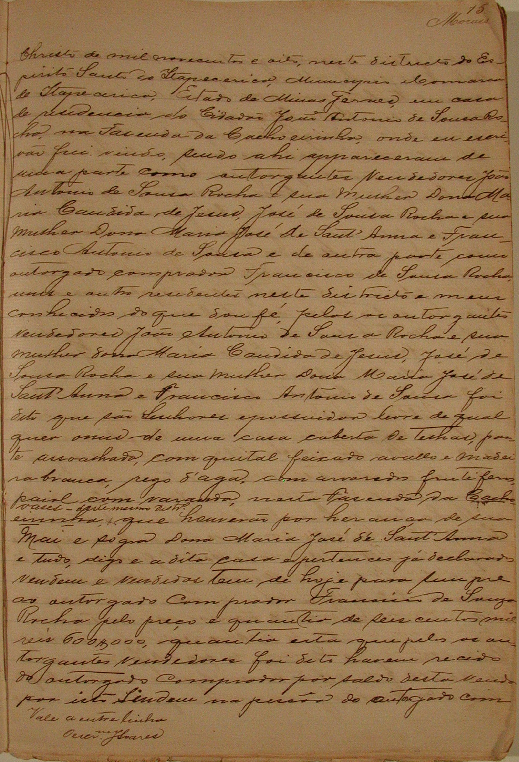 ESCRITURA PÚBLICA DE COMPRA E VENDA QUE FAZEM COMO AUTORGANTE VENDEDOR JOÃO ANTONIO DE SOUSA ROCHA E SUA MULHER DONA MARIA JOSÉ CANDIDA DE JESUS, JOSE DE SOUSA ROCHA E SUA MULHER DONA MARIA JOSÉ DE SANTANNA E FRANCISCO ANTONIO DE SOUSA E COMO COMPRADOR FRANCISCO DE SOUSA ROCHA, A VENDA DE UMA CASA COBERTA DE TELHAS ASSOALHADA, COM REGO DAGUA, ARVOREDOS FRUTÍFEROS, NA FAZENDA DA CACHOEIRINHA PELO PREÇO DE 600 MIL RÉIS.