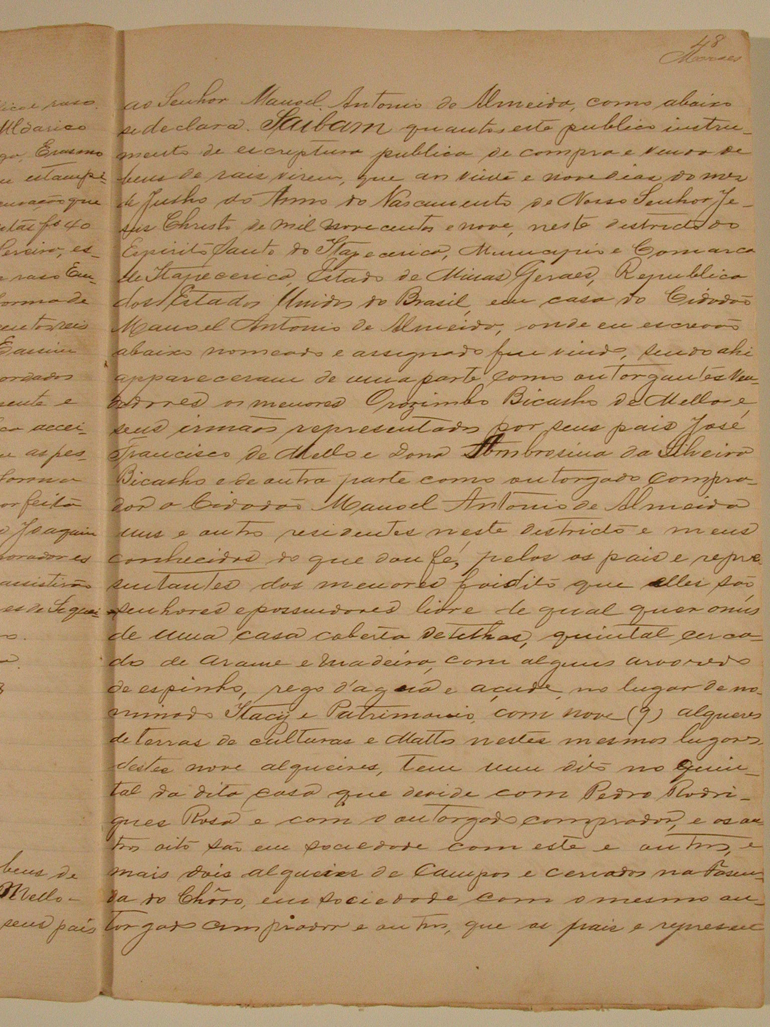 ESCRITURA PÚBLICA DE COMPRA E VENDA DE BENS DE RAIZ FAZEM OROSIMBO BICALHO DE MELLO E SEUS IRMÃOS MENORES REPRESENTADOS POR SEUS PAIS JOSÉ FRANCISCO DE MELO E DONA AMBROSINA DA SILVEIRA BICALHO AO SENHOR MANOEL ANTONIO DE ALMEIDA, A VENDA DE UMA CASA NO LUGAR DENOMINADO ITACY E PATRIMONIO COM NOVE ALQUEIRES DE TERRAS DE CULTURAS E MATOS, E MAIS DOIS ALQUEIRES DE TERRAS NA FASENDA DO CHORO EM SOCIEDADE COM O MESMO OUTORGADO COMPRADOR, PELA QUANTIA DE 1 CONTO DE RÉIS.