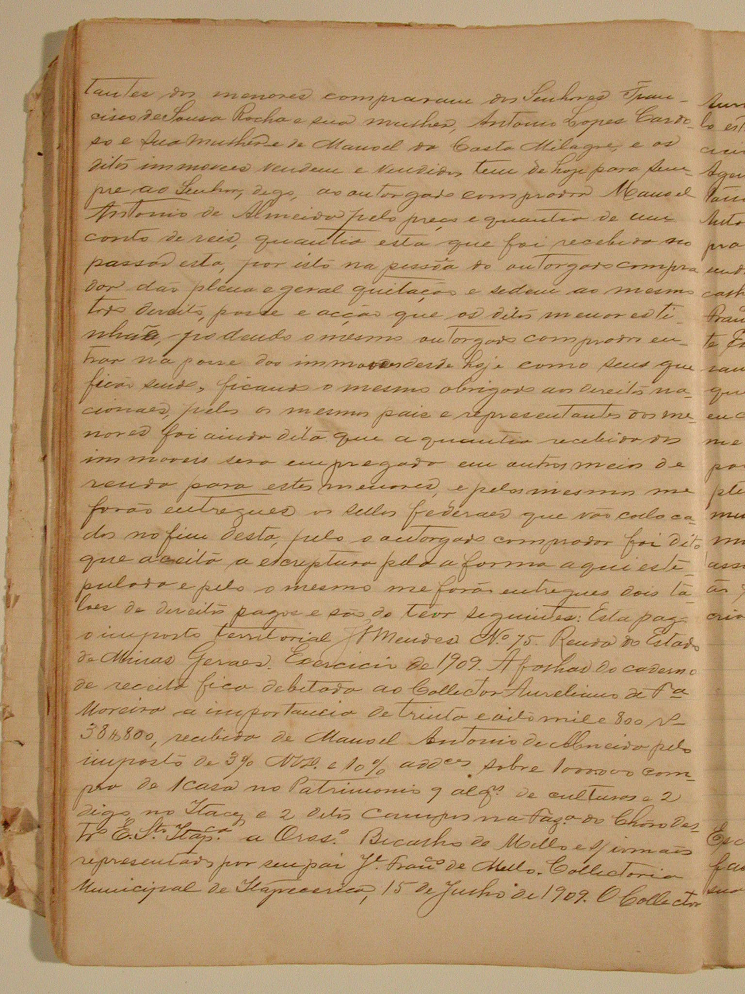 ESCRITURA PÚBLICA DE COMPRA E VENDA DE BENS DE RAIZ FAZEM OROSIMBO BICALHO DE MELLO E SEUS IRMÃOS MENORES REPRESENTADOS POR SEUS PAIS JOSÉ FRANCISCO DE MELO E DONA AMBROSINA DA SILVEIRA BICALHO AO SENHOR MANOEL ANTONIO DE ALMEIDA, A VENDA DE UMA CASA NO LUGAR DENOMINADO ITACY E PATRIMONIO COM NOVE ALQUEIRES DE TERRAS DE CULTURAS E MATOS, E MAIS DOIS ALQUEIRES DE TERRAS NA FASENDA DO CHORO EM SOCIEDADE COM O MESMO OUTORGADO COMPRADOR, PELA QUANTIA DE 1 CONTO DE RÉIS.