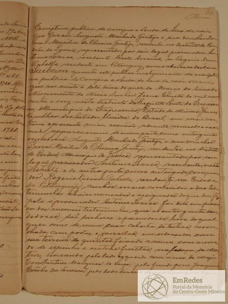 ESCRITURA PÚBLICA DE COMPRA E VENDA DE BENS DE RAIZ QUE FAZEM AUGUSTO MACHADO GONTIJO E SUA MULHER DONA MASÍLIA DE OLIVEIRA GONTIJO RESIDENTE NO DISTRITO DE PERDÕES DE LAVRAS, REPRESENTADOS POR SEU PROCURADOR ANTÔNIO SOARES A ROGÉRIO XAVIER RABELLO, A VENDA DE UMA CASA COBERTA DE TELHAS, COM UM TERRENO DE QUINTAL FECHADO A MURONA PRAÇA DA MATRIZ, PELA QUANTIA DE 3 CONTOS DE RÉIS