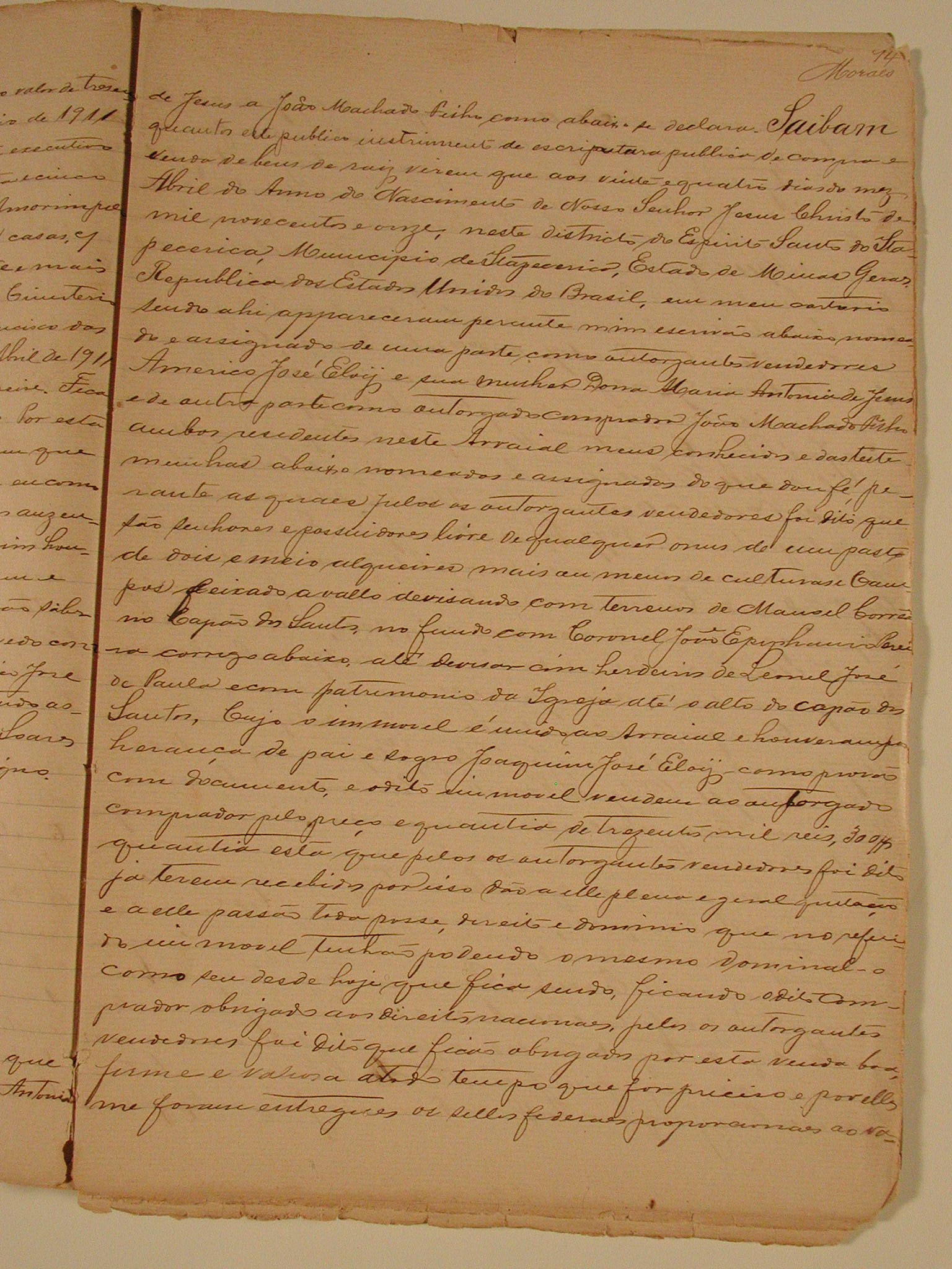 ESCRITURA PÚBLICA DE COMPRA E VENDA DE BENS DE RAIZ QUE FAZEM AMÉRICO JOSÉ ELOY E SUA MULHER DONA MARIA ANTONIA DE JESUS A JOÃO MACHADO FILHO, A VENDA DE 1 PASTO DE 2 E ½ ALQUEIRES DE CULTURA, CUJO IMÓVEL É UNIDO AO ARRAIAL, PELA QUANTIA DE 300 MIL RÉIS.