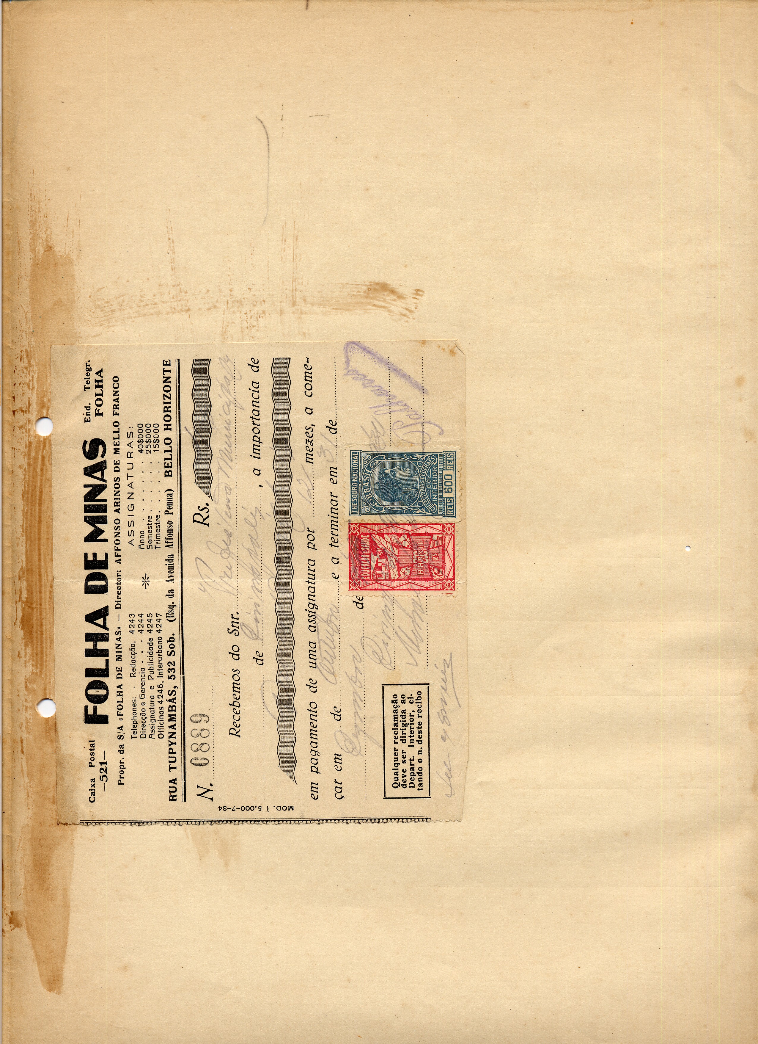 OBS: RECIBO REFERENTE AO PAGAMENTO DE ASSINATURA ANUAL DO JORNAL FOLHA DE MINAS.