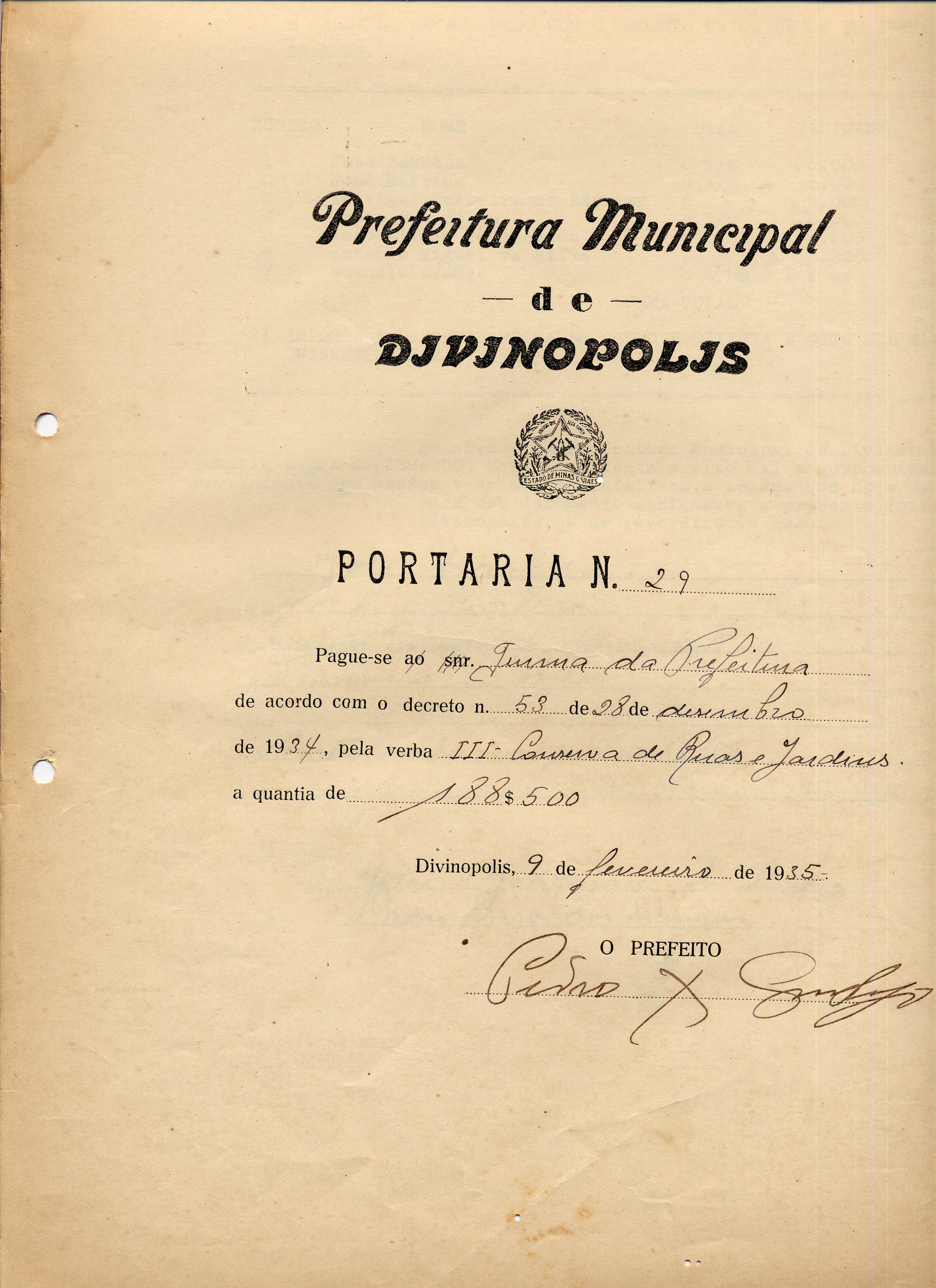 PAGUE-SE A TURMA DA PREFEITURA DE ACORDO COM O DECRETO Nº 53 DE 28 DE DESEMBRO(SIC) DE 1934 PELA VERBA III - CONSERVA DE RUAS E JARDINS A QUANTIA DE 188$500 (CENTO E OITENTA E OITO MIL E QUINHENTOS RÉIS).