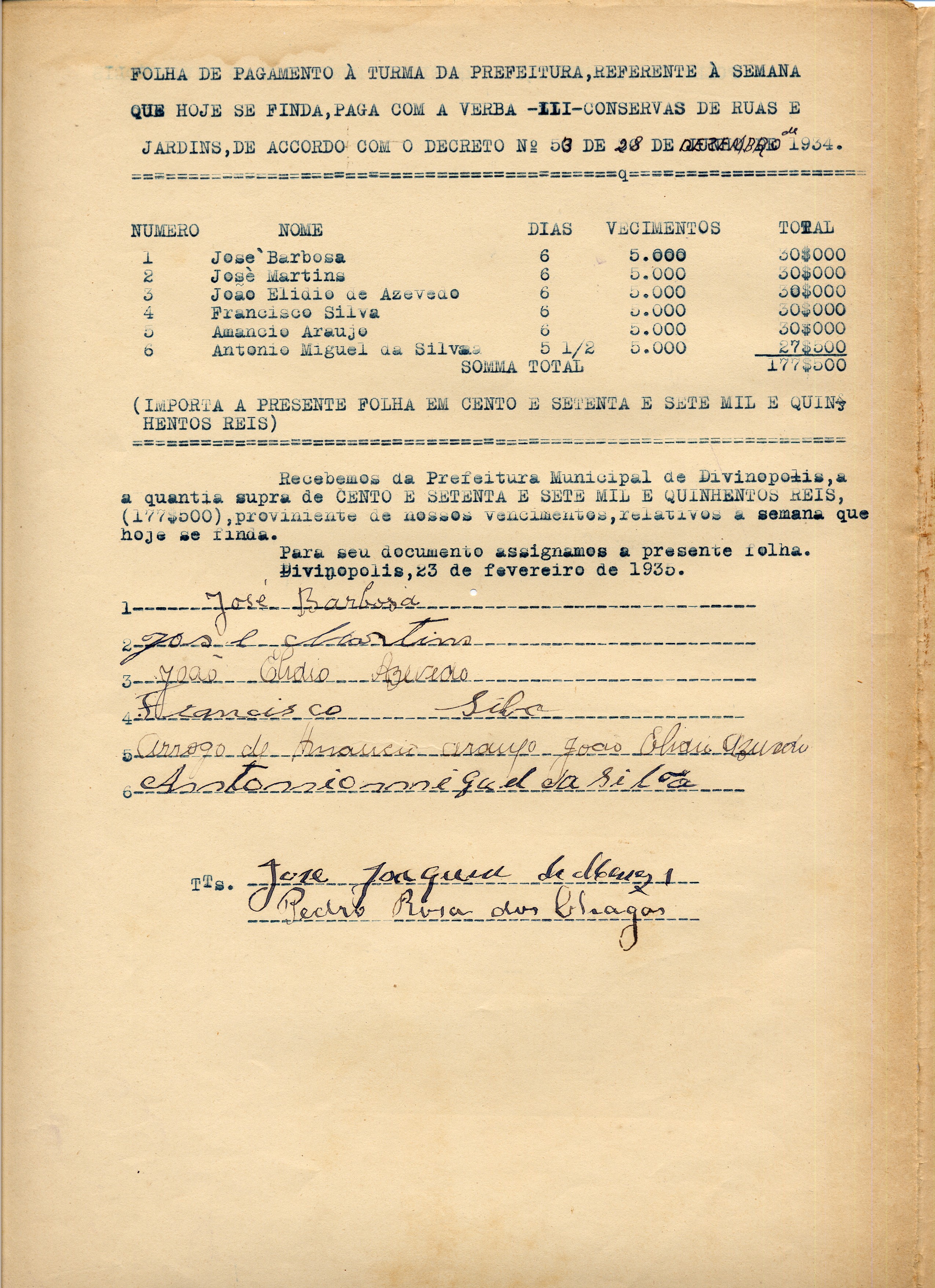 PAGUE-SE A TURMA DA PREFEITURA DE ACORDO COM O DECRETO Nº 53 DE 28 DE DESEMBRO(SIC) DE 1934 PELA VERBA III - COSNSERVA DE RUAS E JARDINS A QUANTIA DE 177$500 (CENTO E SETENTA E SETE MIL RÉIS).