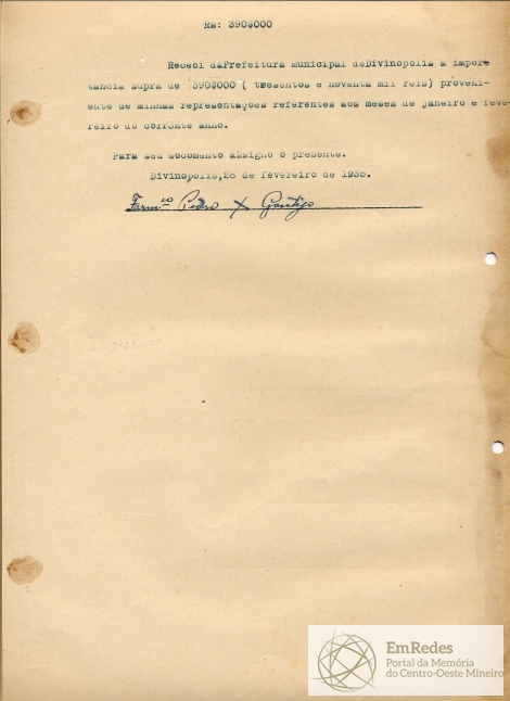 PAGUE-SE AO SNR. PEDRO X. GONTIJO DE ACORDO COM O DECRETO Nº 53 DE 28 DE DESEMBRO(SIC) DE 1934 PELA VERBA I - SUBSÍDIO DO PREFEITO A QUANTIA DE 390$000 (TREZENTOS E NOVENTA MIL RÉIS).