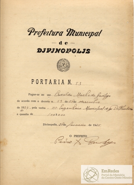 PAGUE-SE AO SNR. OSWALDO MACHADO GONTIJO DE ACORDO COM O DECRETO Nº 53 DE 28 DE DESEMBRO(SIC) DE 1934, PELA VERBA III- ENGENHEIRO A QUANTIA DE 100$000 (CEM MIL RÉIS).