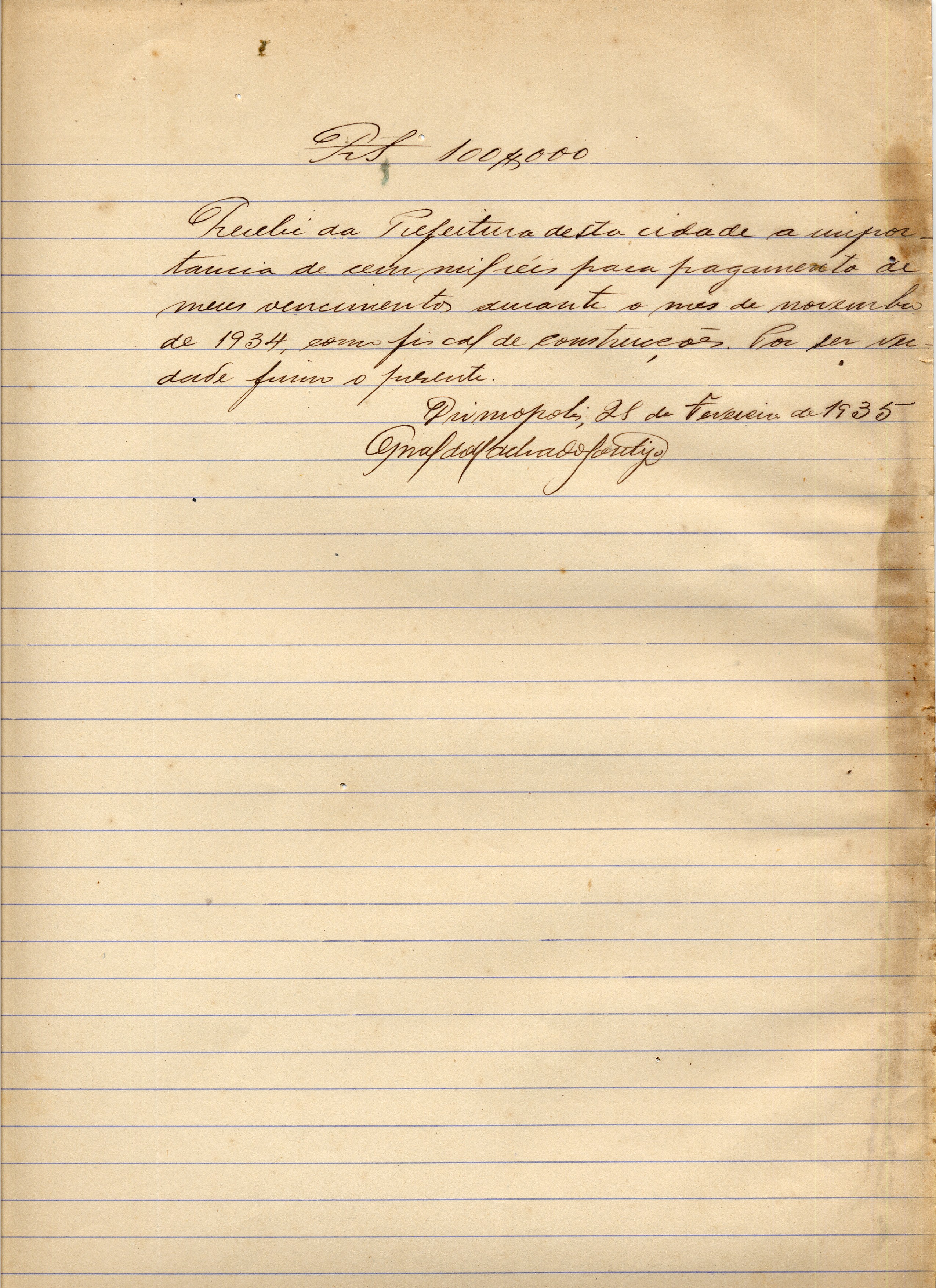 OBS: RECIBO DE PAGAMENTO REFERENTE AOS SEUS VENCIMENTOS DURANTE MÊS DE NOVEMBRO DE 1934, COMO FISCAL DE CONSTRUÇÕES.