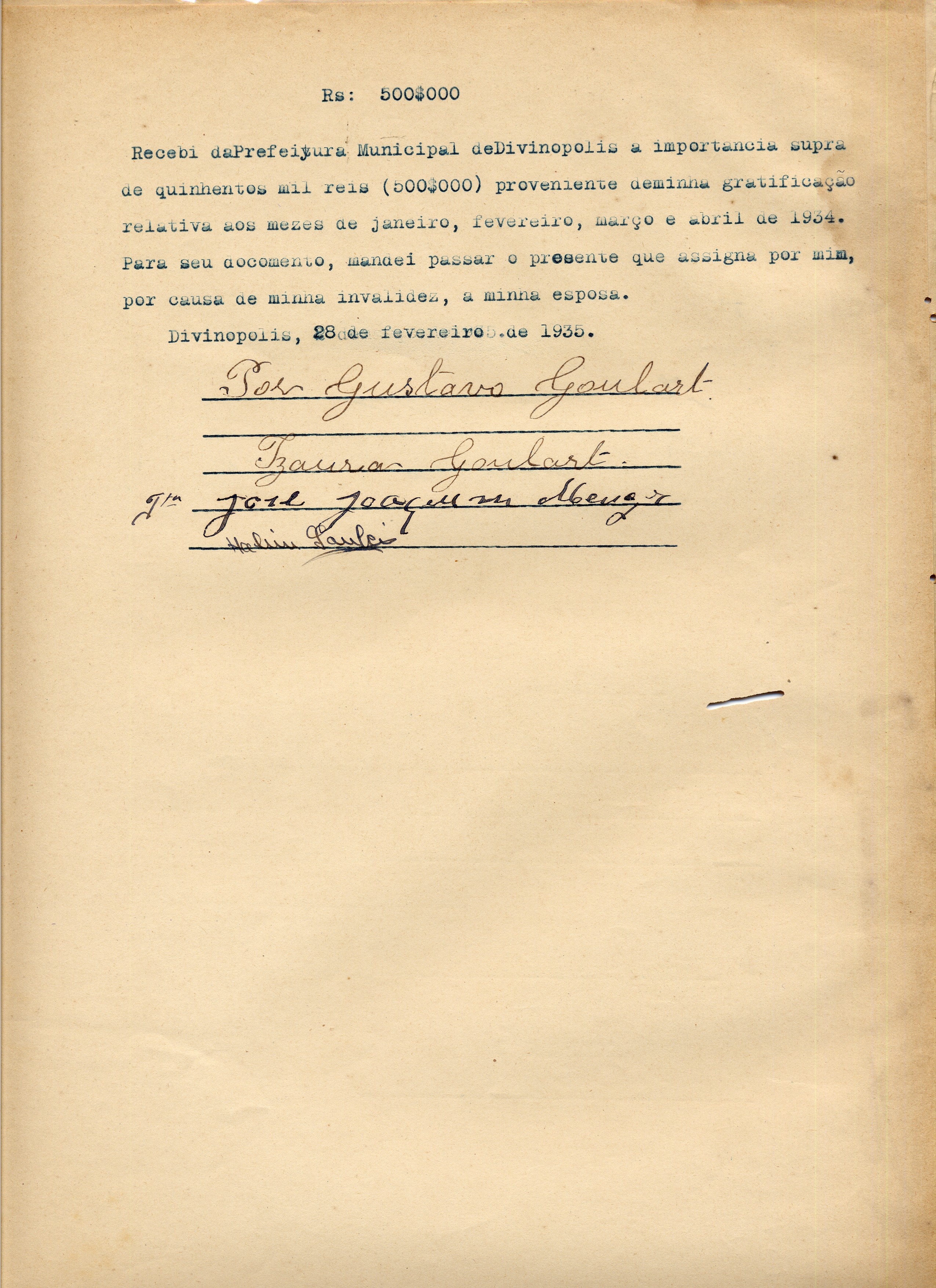 PAGUE-SE AO SNR. GUSTAVO GOULART DE ACORDO COM O DECRETO Nº 53 DE 28 DE DESEMBRO(SIC) DE 1934, PELA VERBA DÍVIDAS FLUCTUANTES(SIC) A QUANTIA DE 500$000 (QUINHENTOS MIL RÉIS).