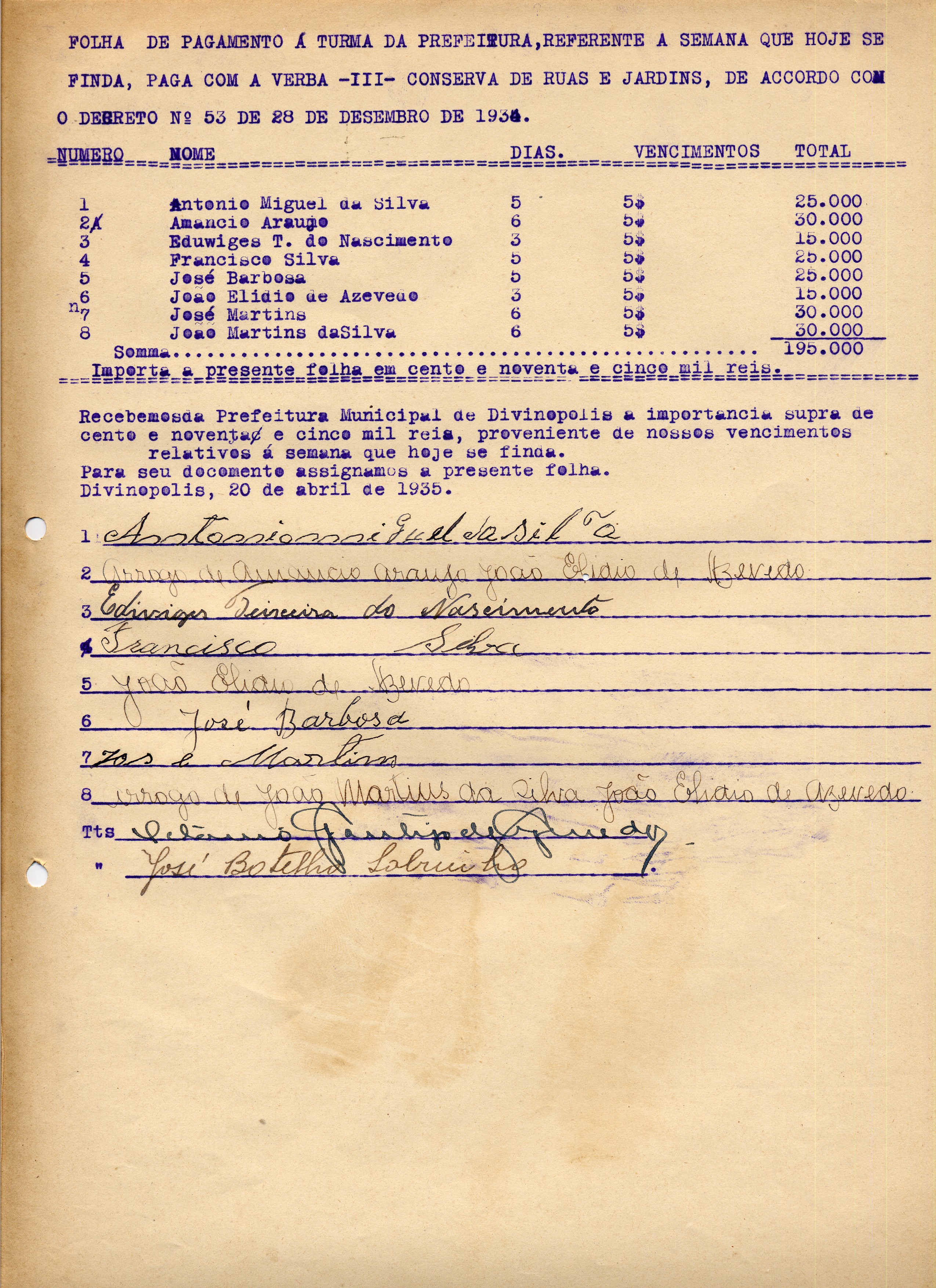 PAGUE-SE A TURMA DA PREFEITURA DE ACORDO COM O DECRETO Nº 53 DE 28 DE DESEMBRO(SIC) DE 1934, PELA VERBA III - CONSERVA DE RUAS E JARDINS A QUANTIA DE 195$000 (CENTO E NOVENTA E CINCO MIL RÉIS).