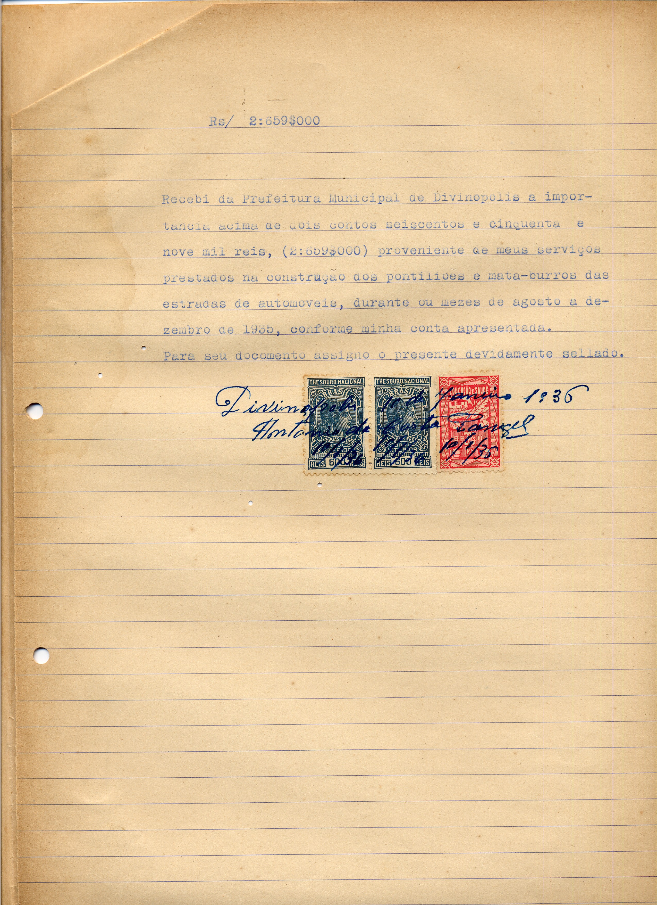 OBS: UM RECIBO DE PAGAMENTO PROVENIENTE DE SERVIÇOS PRESTADOS NA CONSTRUÇÃO DOS PONTILHÕES E MATA-BURROS DAS ESTRADAS, DE AGOSTO A DEZEMBRO DE 1935.
