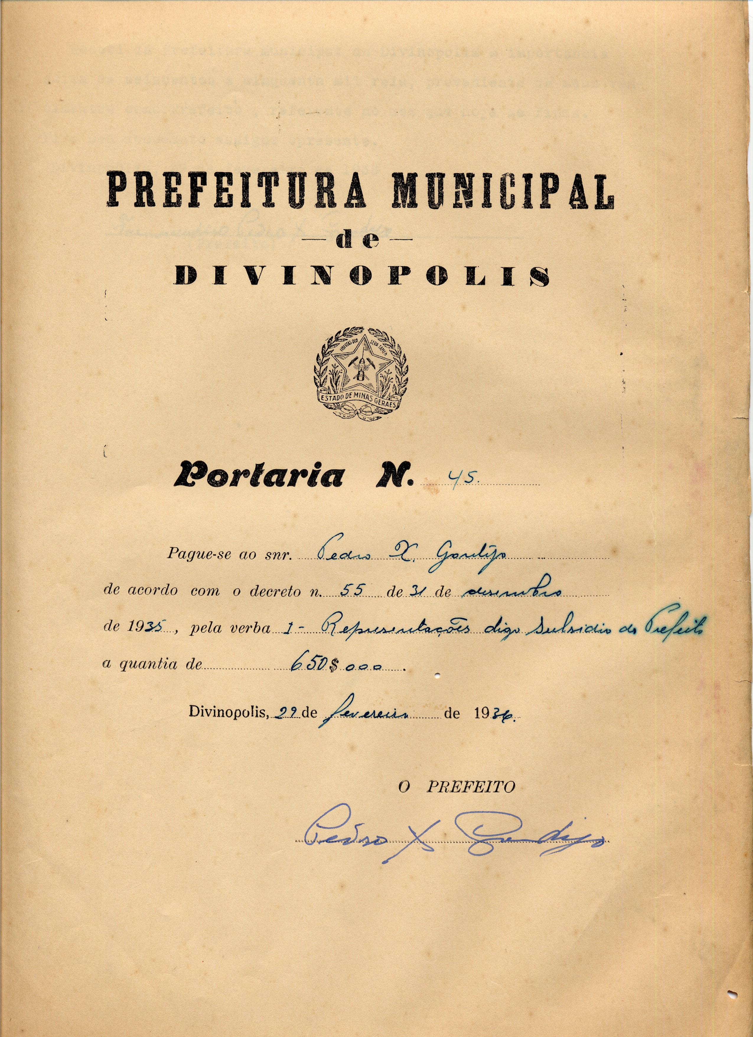 PAGUE-SE AO SNR. PEDRO X. GONTIJO DE ACORDO COM O DECRETO Nº 55 DE 31 DE DESEMBRO(SIC) DE 1935, PELA VERBA I-SUBSÍDIO DO PREFEITO A QUANTIA DE 650$000 (SEISCENTOS E CINQUENTA MIL RÉIS).
