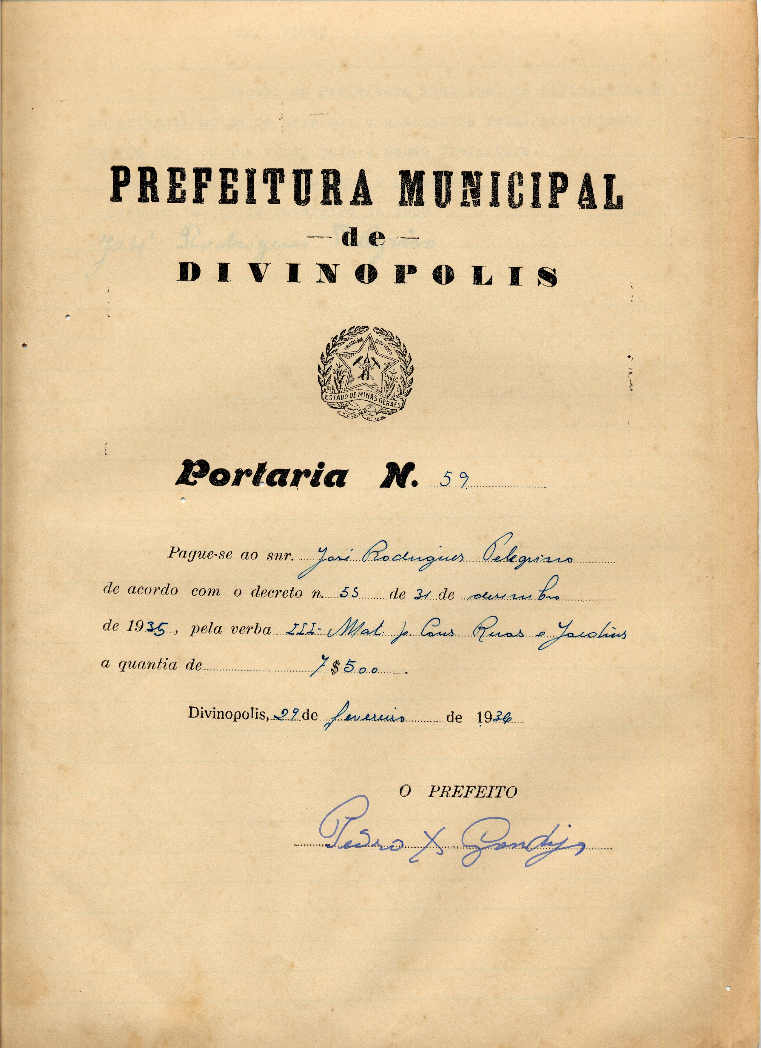 PAGUE-SE AO SNR. JOSÉ RODRIGUES PELEGRINO DE ACORDO COM O DECRETO Nº 55 DE 31 DE DESEMBRO(SIC) DE 1935, PELA VERBA III-MAT.(SIC0 P/ CONS.(SIC) RUAS E JARDINS A QUANTIA DE 7$500 (SETE MIL E QUINHENTOS RÉIS).