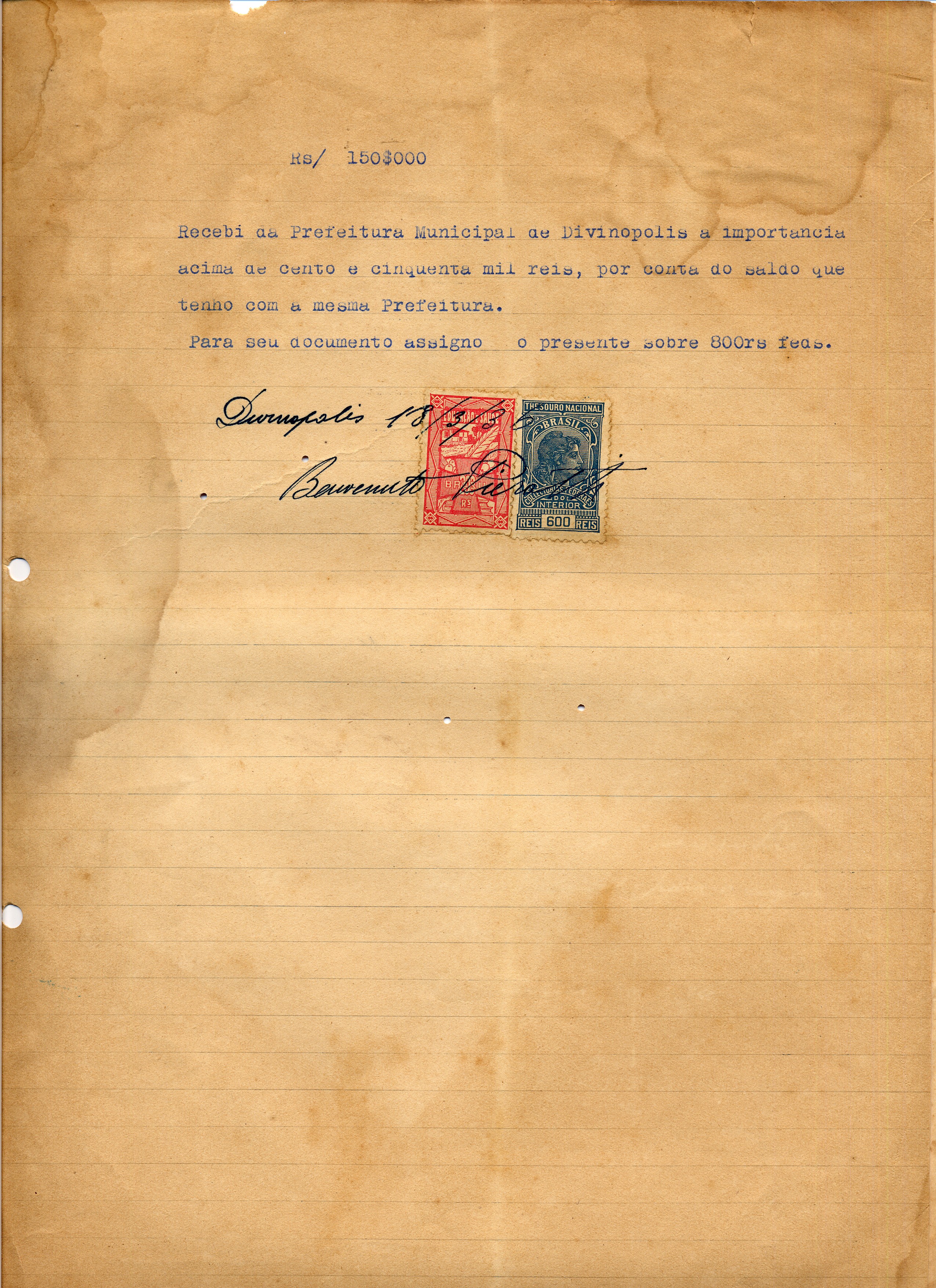 PAGUE-SE AO SNR. BENENVENUTO PIEROTE DE ACORDO COM O DECRETO Nº 55 DE 31 DE DEZEMBRO DE 1935, PELA VERBA III-MATERIAL PARA A ÁGUA A QUANTIA DE 150$000 (CENTO E CINQUENTA MIL RÉIS).