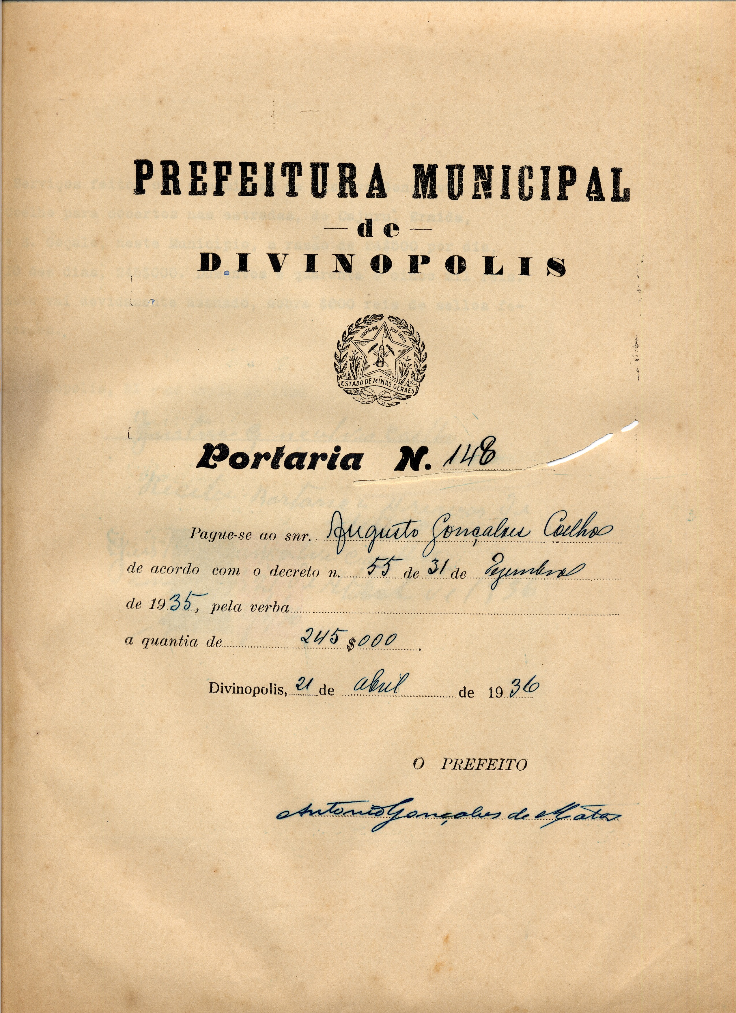 PAGUE-SE AO SNR. AUGUSTO GONÇALVES COELHO DE ACORDO COM O DECRETO Nº 55 DE 31 DE DEZEMBRO DE 1935, PELA VERBA ___(SIC) A QUANTIA DE 245$000 (DUZENTOS E QUARENTA E CINCO MIL RÉIS).