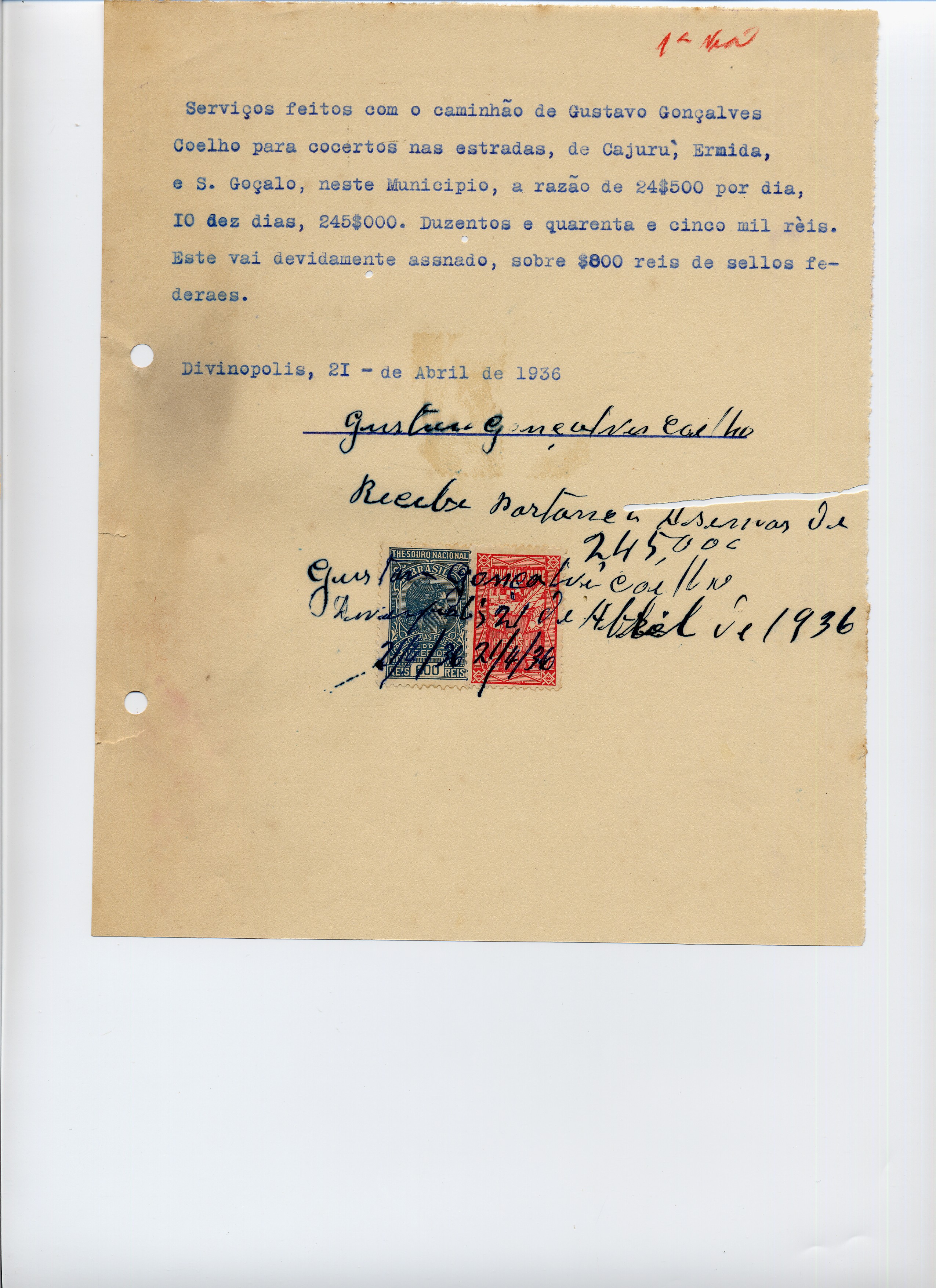 OBS: RECIBO REFERENTE A SERVIÇOS FEITOS COM O CAMINHÃO DE GUSTAVO GONÇALVES COELHO PARA CONSERTOS NAS ESTRADAS DE CAJURU, ERMIDA E S. GONÇALO.