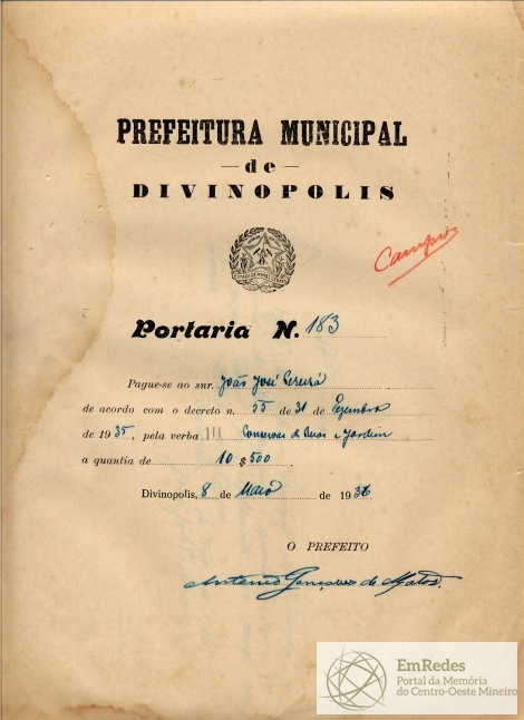 PAGUE-SE AO SNR. JOÃO JOSÉ PEREIRA DE ACORDO COM O DECRETO Nº 55 DE 31 DE DEZEMBRO DE 1935, PELA VERBA III- CONSERVA DE RUAS E JARDINS A QUANTIA DE 10$000 (DEZ MIL RÉIS).