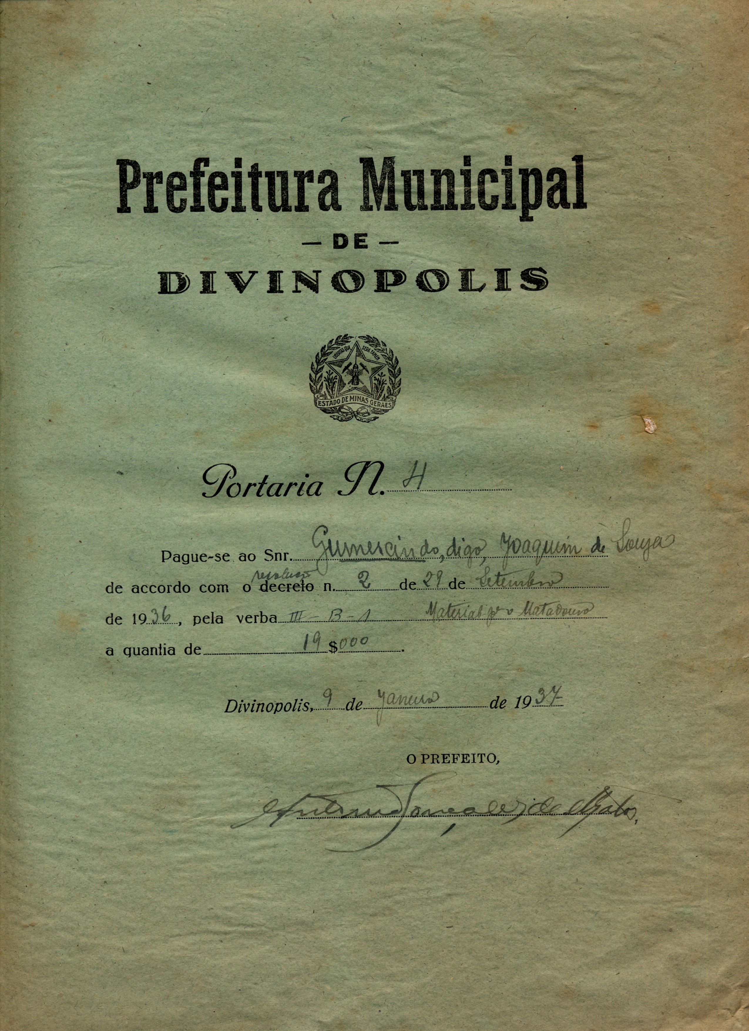 PAGUE-SE AO SNR. GUMERCINDO, DIGO(SIC) JOAQUIM DE SOUZA DE ACORDO COM A RESOLUÇÃO Nº 02 DE 29 DE SETEMBRO DE 1936, PELA VERBA III- B.1 - MATERIAL P/ O MATADOURO A QUANTIA DE 19$000 (DEZENOVE MIL RÉIS).